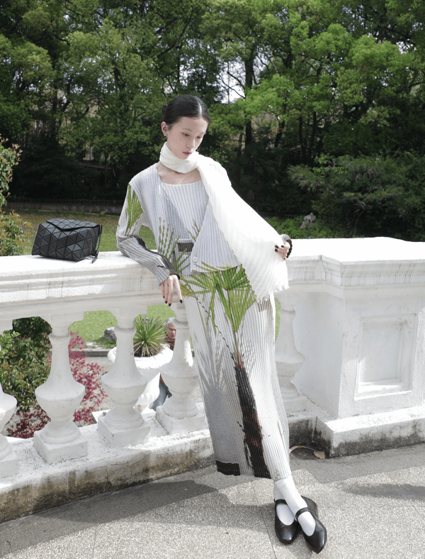 小众风格的服装也是自带文艺高级的感觉,百褶面料上手绘着绿色植物,有特色的同时还能让人眼前一亮。