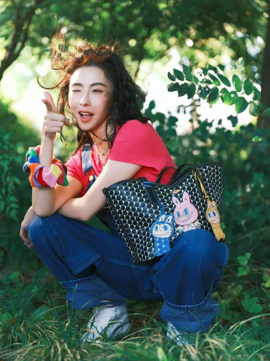 背带裤的穿法别具一格,张柏芝将一侧肩带正常搭在肩上,另一侧则随意下垂,露出内里的设计层次感。她搭配的黑色包包点缀着整齐排列的白色图案,上方挂着几个彩色小玩偶吊饰,粉色、蓝色、黄色交织其中,为整体穿搭增添了几分俏皮灵动。