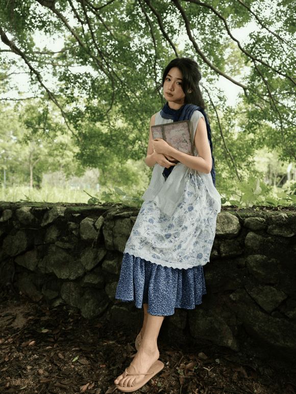 白色带花朵无袖上衣搭配蓝色碎花裙,很清新的一套look,穿上后秒变文艺小白花女神,带着一丝淡淡的忧伤的女生。