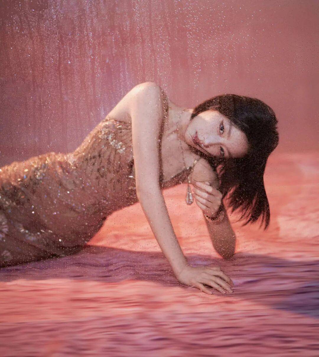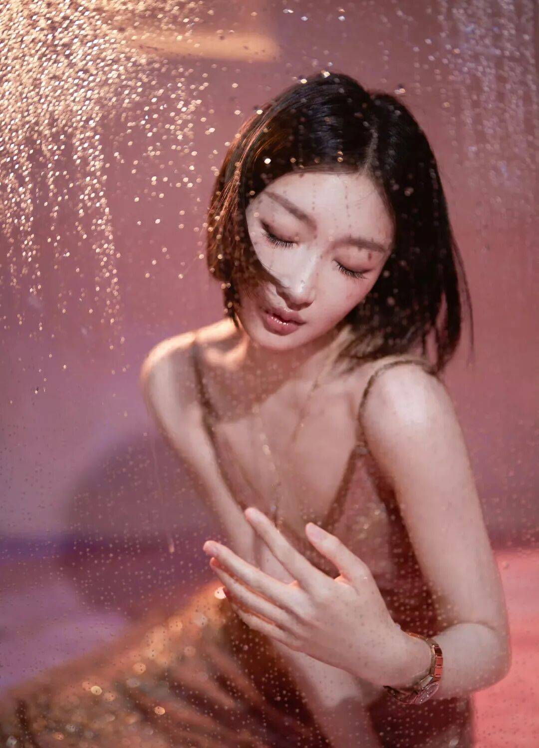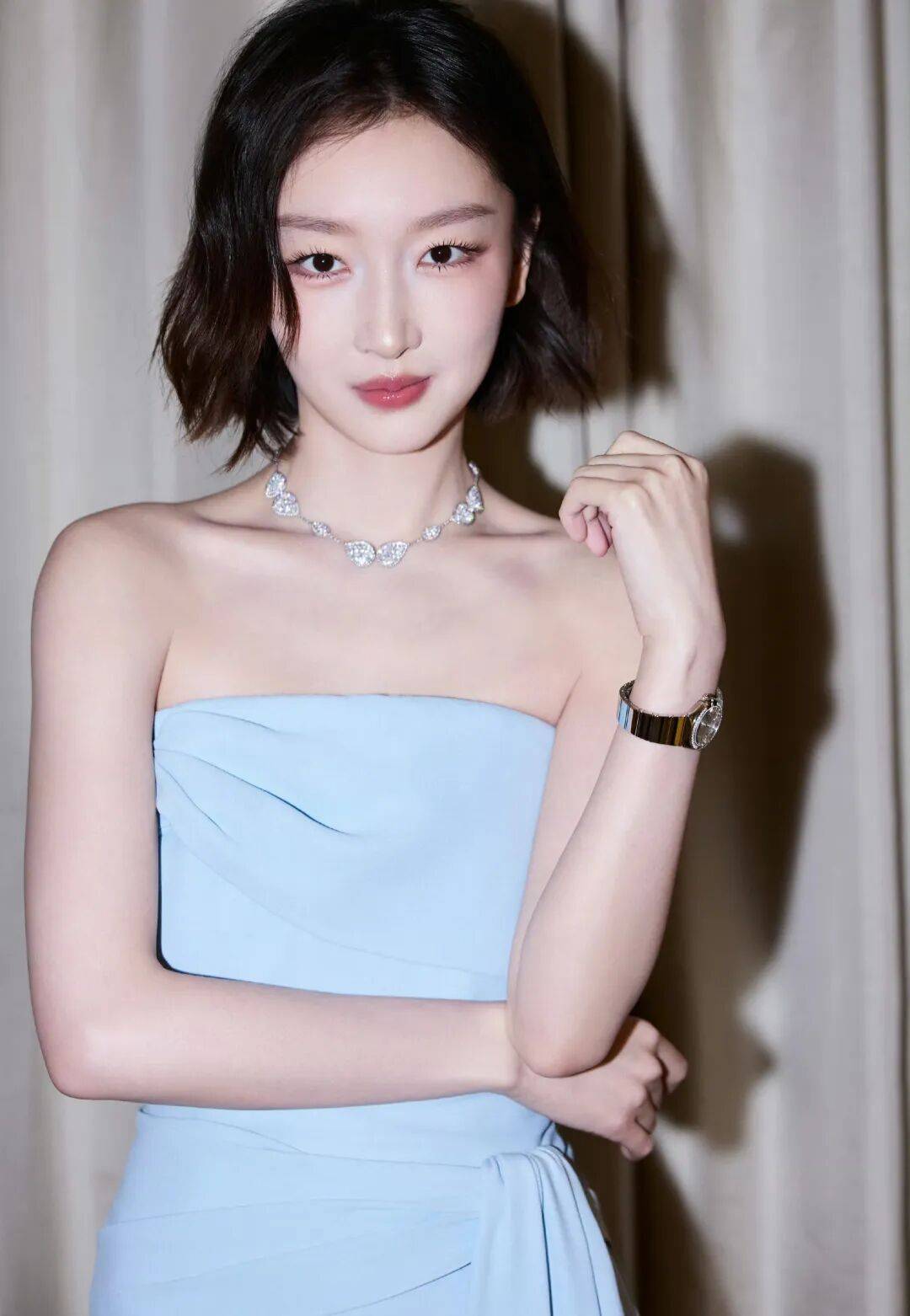 利落的短发中和了裙装的柔媚,叠戴的长项链和精致腕表点缀细节,整体造型层次感十足,清冷与妩媚碰撞出独特的魅力。