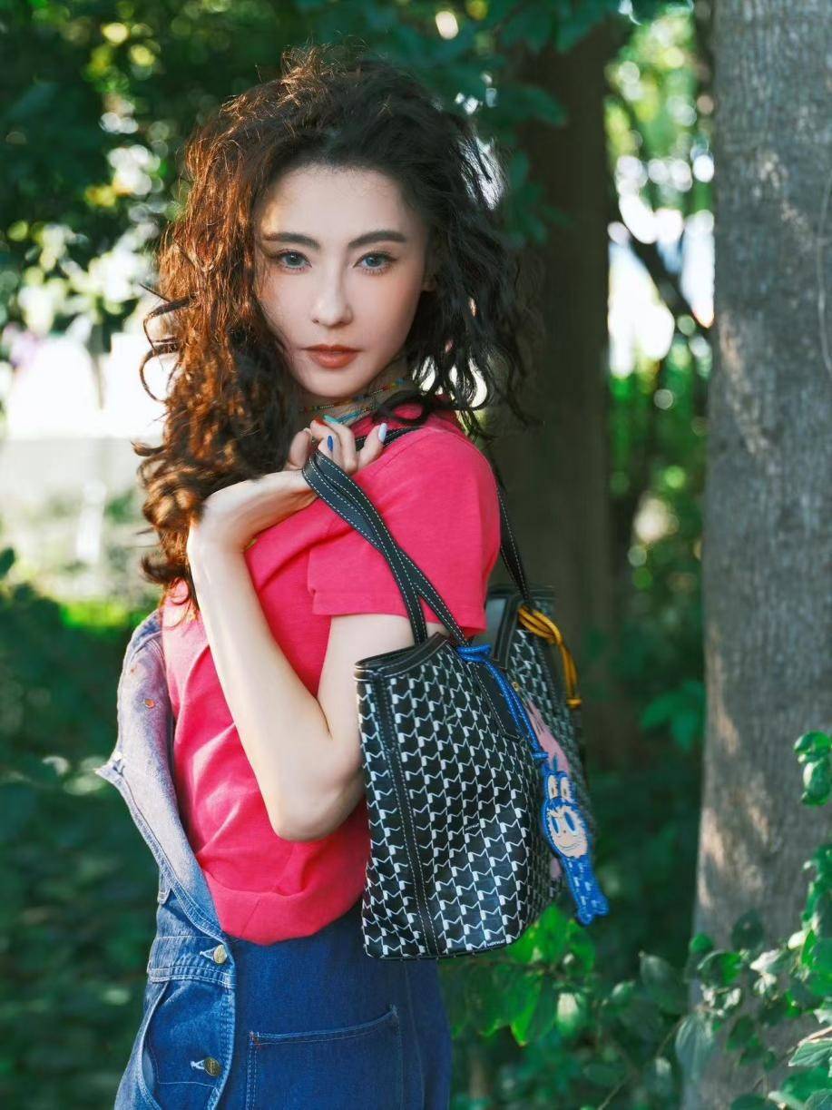 张柏芝新烫了羊毛卷发型减龄25岁,穿粉T+背带裤,美得像换了个人