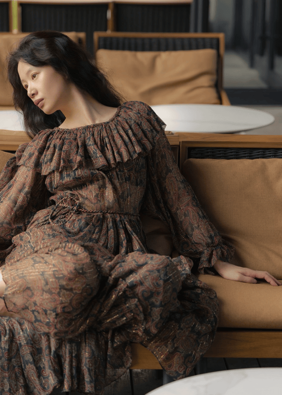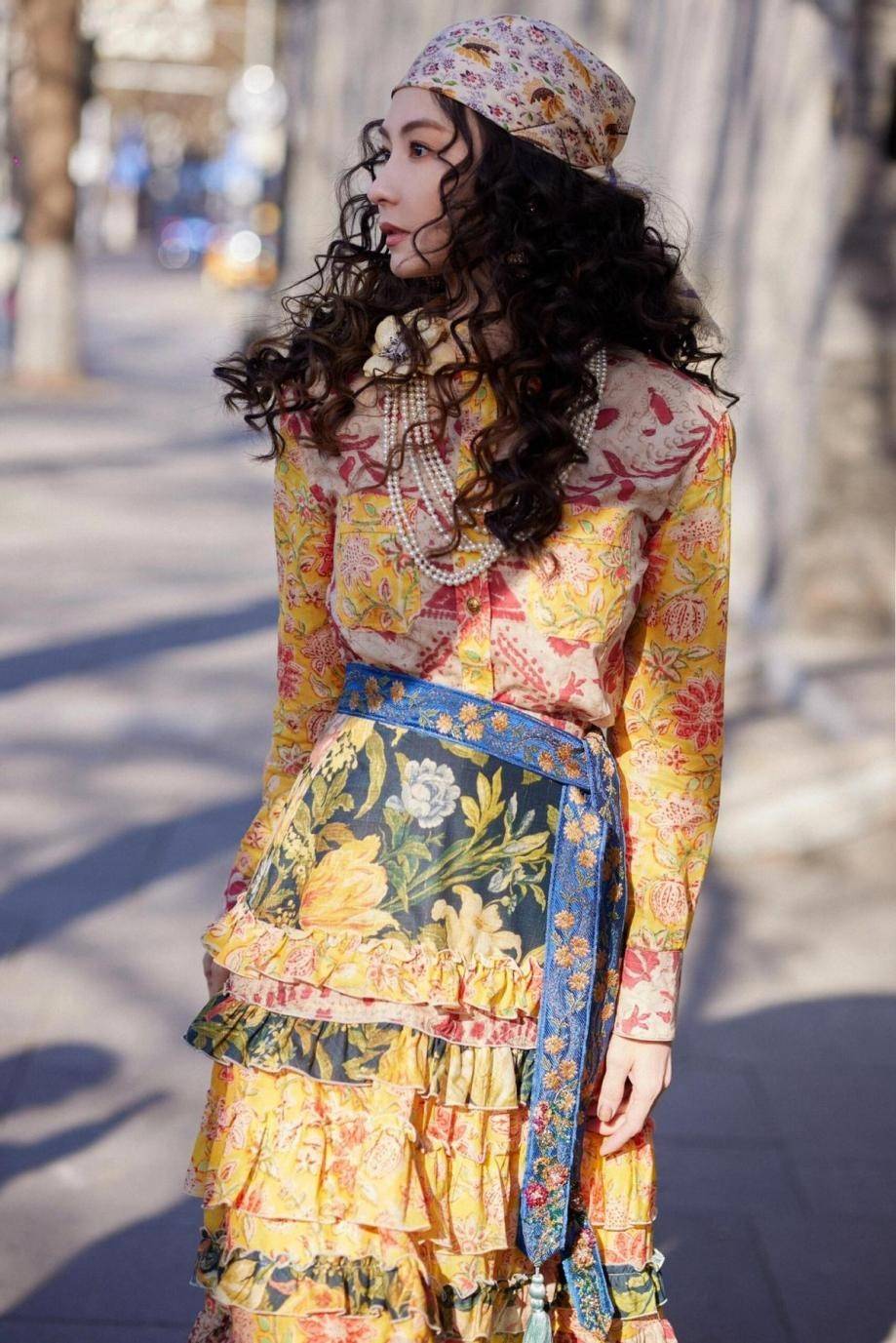 第三套穿搭则以头巾为亮点,细碎温柔的花纹与服装风格相得益彰。她身着黄调印花套装,上衣为衬衫款,底色暖黄,红粉复古花案点缀其上。下身是层层蛋糕裙,每一层荷叶边随步伐轻轻晃动,带出软糯质感,让人忍不住多看几眼。
