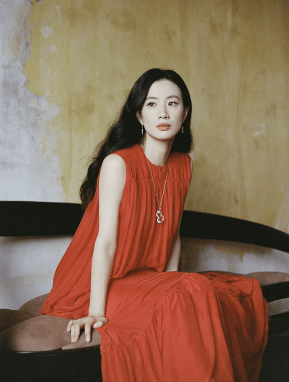 一身红裙带着清冷与疏离感,纯棉直筒长裙让身材不用那么大的负担,配上钻石长项链和李梦自带故事感的脸,文艺范一下子就出来了。