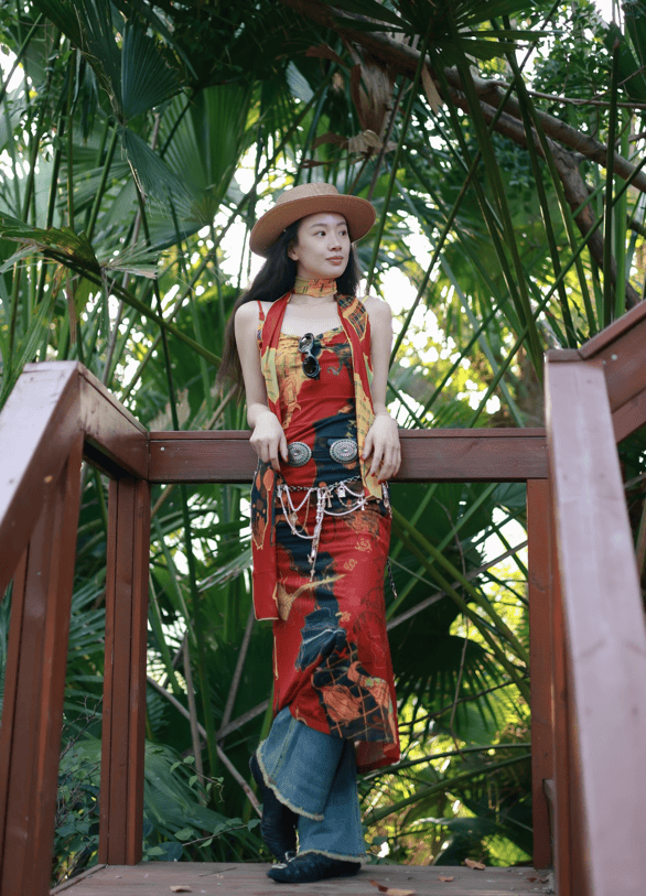 不规则图案的红色连衣裙充满自由与松弛,叠戴金属腰链和草编帽,最有意思的是裙子里叠穿一条做旧款牛仔裤,直接把穿搭玩出花样的最高境界。