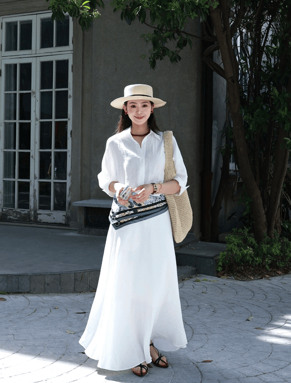 纯白色衬衫长裙很有夏天的感觉,搭配一系列的配饰来轻松驾驭文艺穿搭。如编织帽、编织包包等,花色丝巾的点缀跟李梦那套造型有着异曲同工之妙。