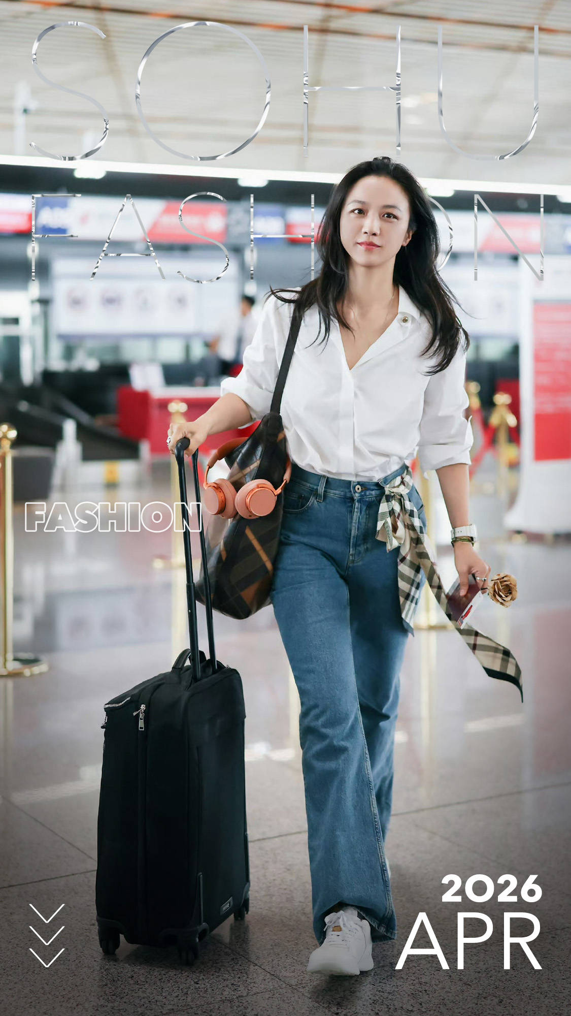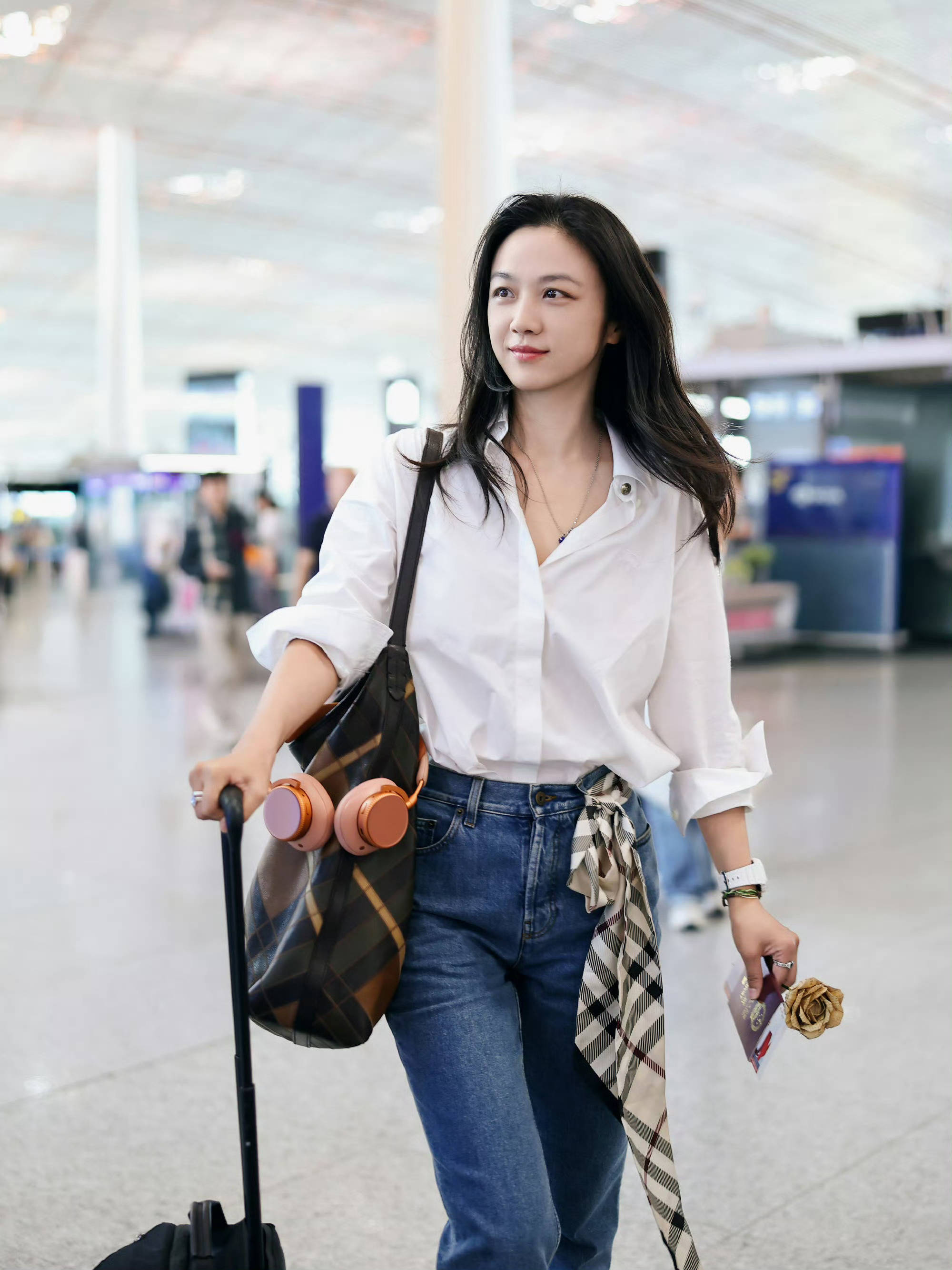 汤唯轻轻松松就把白衬衫穿出了松弛的随性氛围感!微敞领口+卷袖口,搭配高腰直筒牛仔裤,随性又不邋遢。腰间系格纹丝巾,用细节打破单调,整体松弛又有格调,