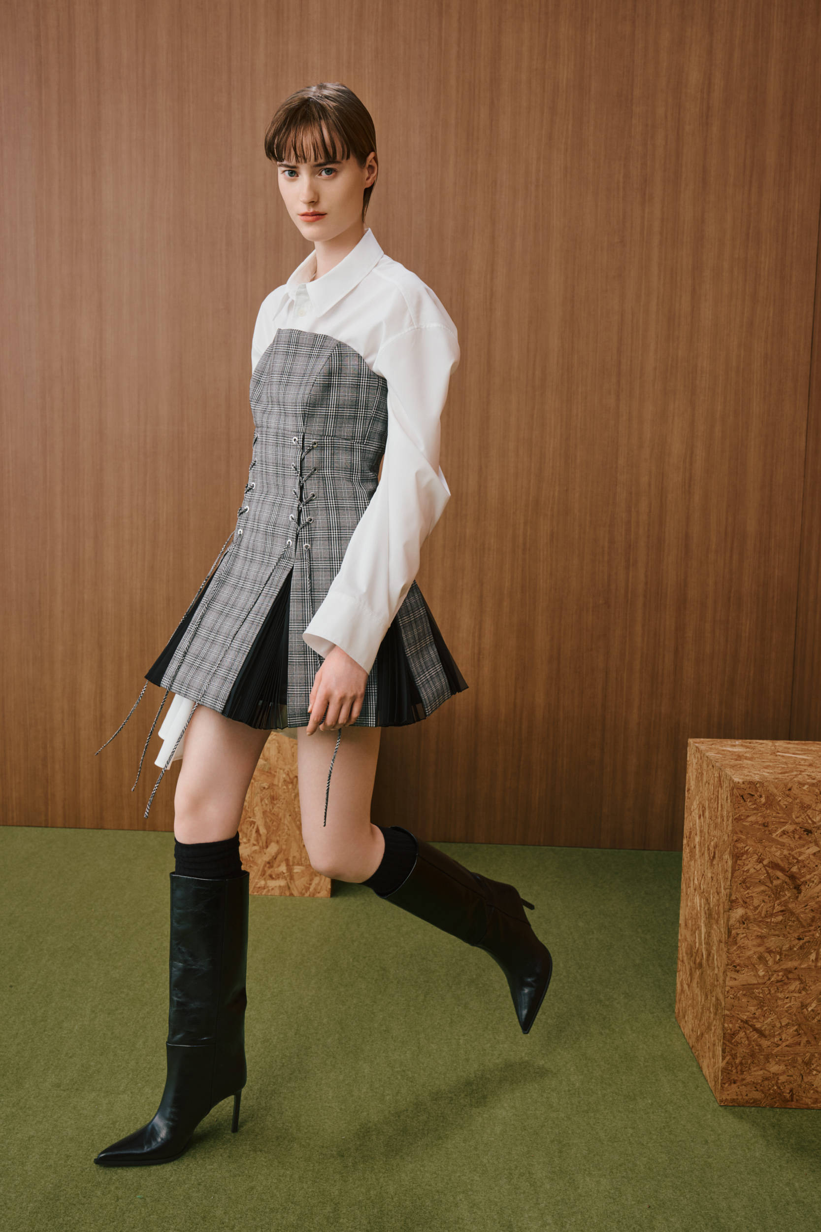 Adeam 2026秋冬秀场,白衬衫叠搭抹胸格纹群、高筒靴,甜辣也可集于一身。