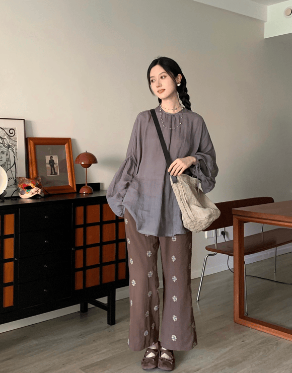 灰色棉麻上衣搭配棕色长裤,复古感配色与花色也是文艺穿搭的标配。