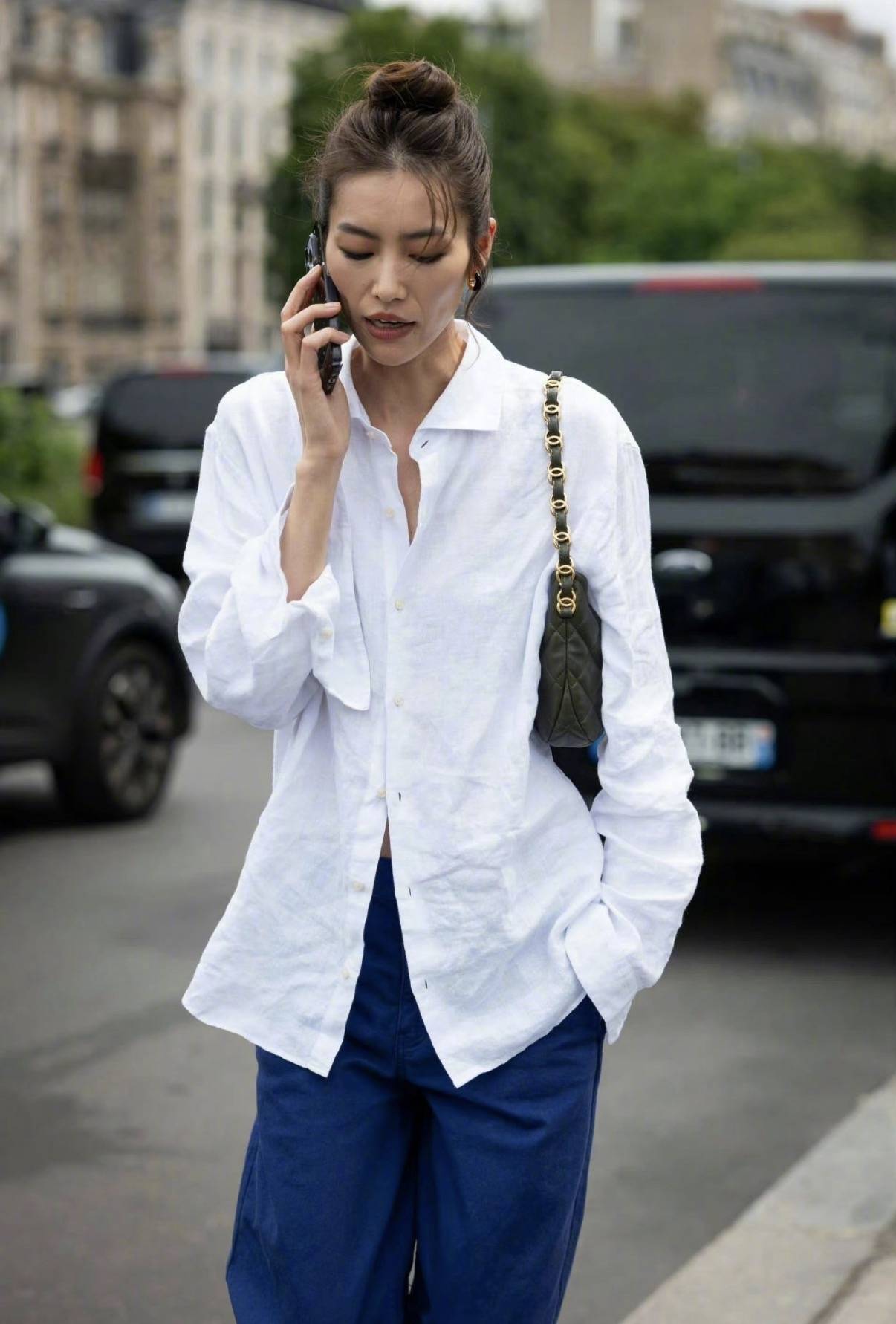 刘雯给出了教科书级别的法式白衬衫穿搭!亚麻质感自带随性慵懒,单穿解开扣子、下摆塞一半,搭配藏蓝阔腿裤,简约却处处是细节,街头感和高级感并存,这才是“毫不费力的时髦”。