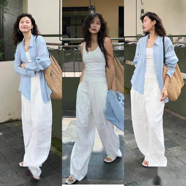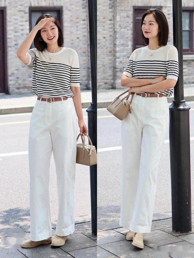 蓝白条纹衬衫 + 白色西装裤 = 法式通勤风