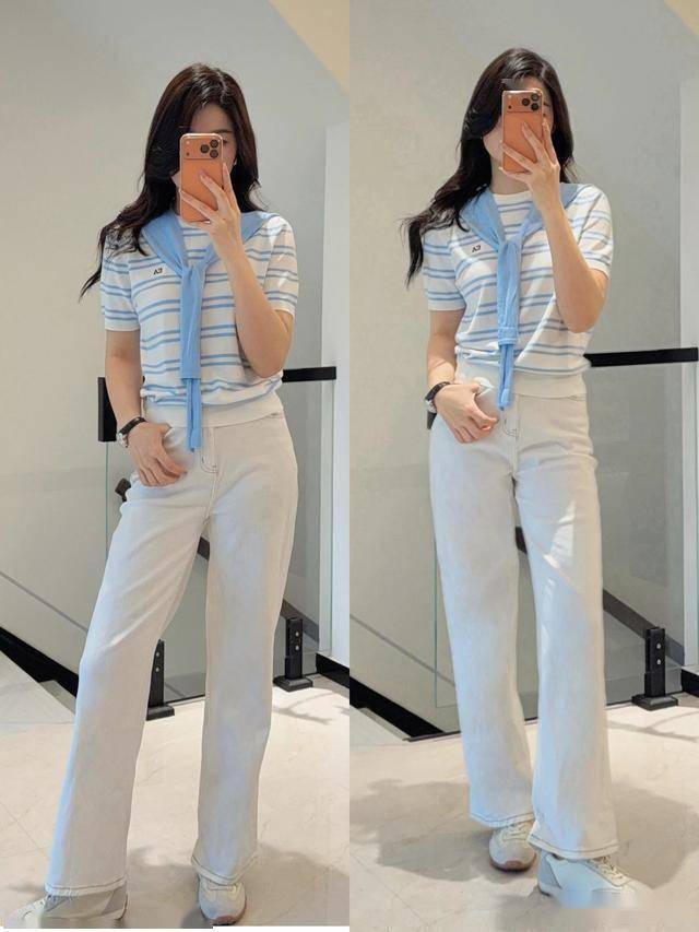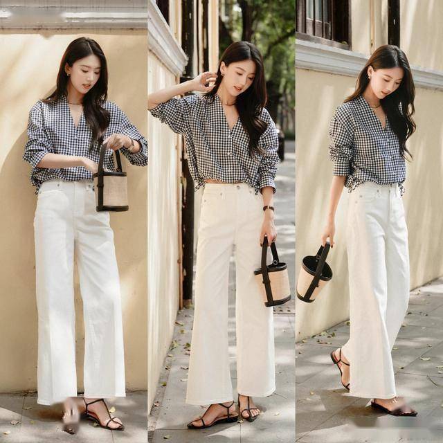 白色牛仔裤:选长款直筒,避免九分款暴露胯部问题