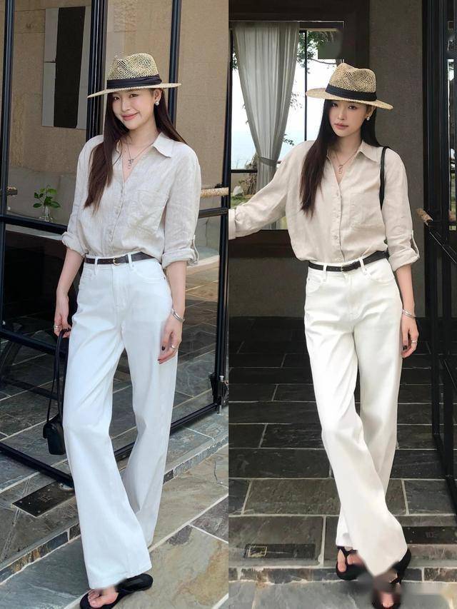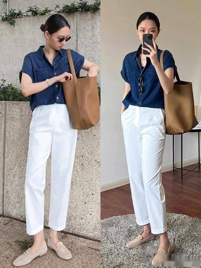牛仔衬衫 + 白色直筒裤 = 休闲干练,把下摆塞进裤子显高