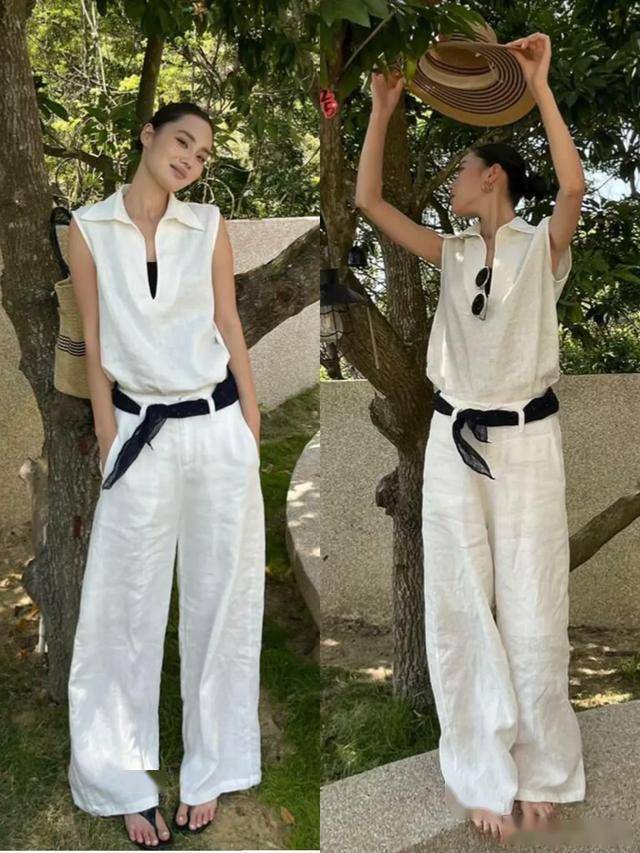 白色T恤 + 白裤 + 燕麦色西装 = 简约清爽