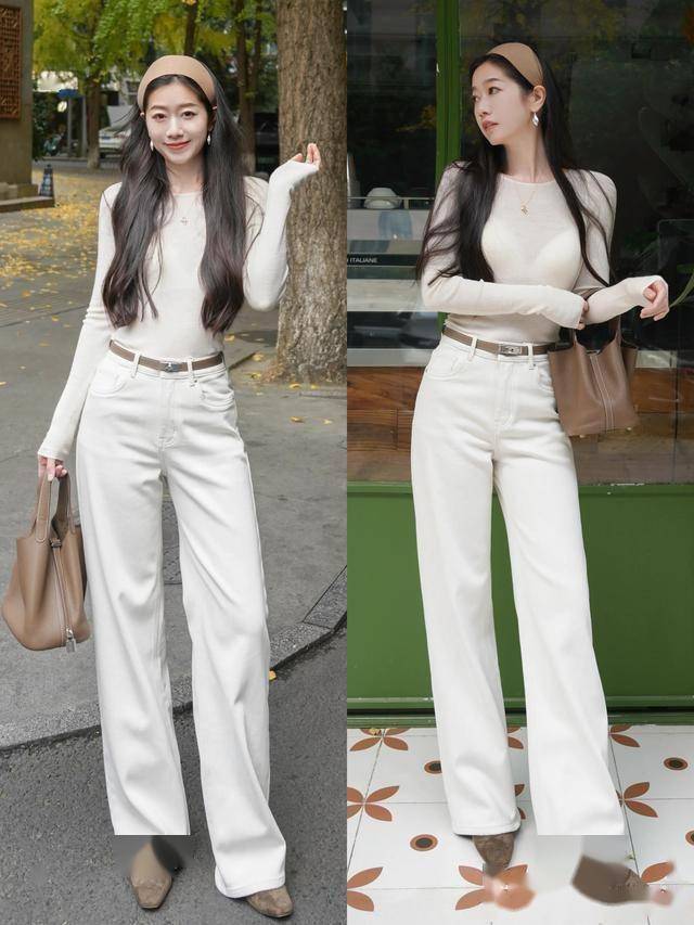 浅咖/米色针织衫 + 白色阔腿裤 = 温柔减龄