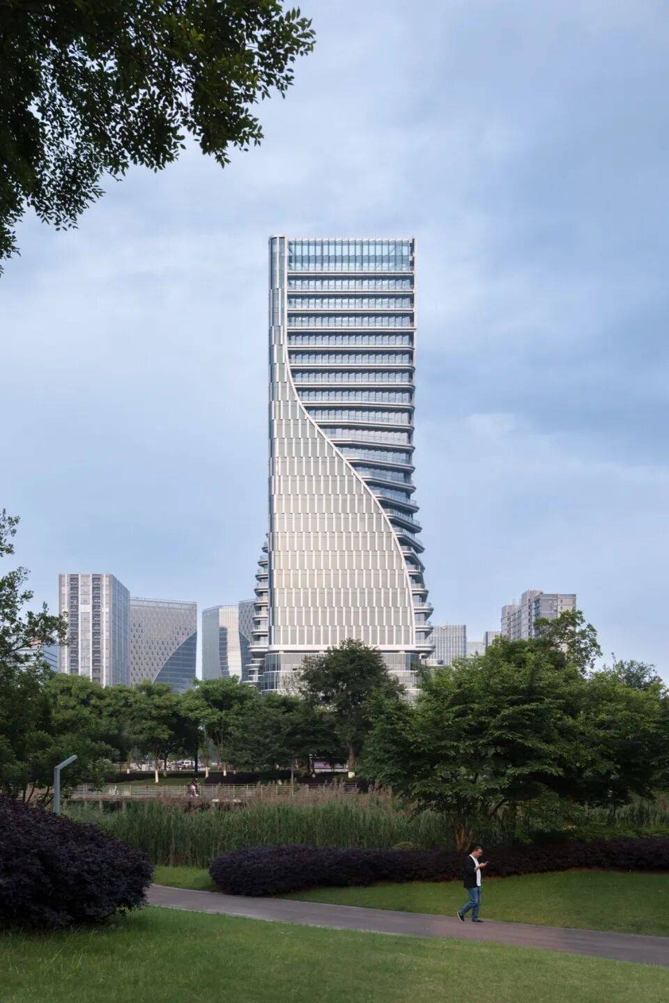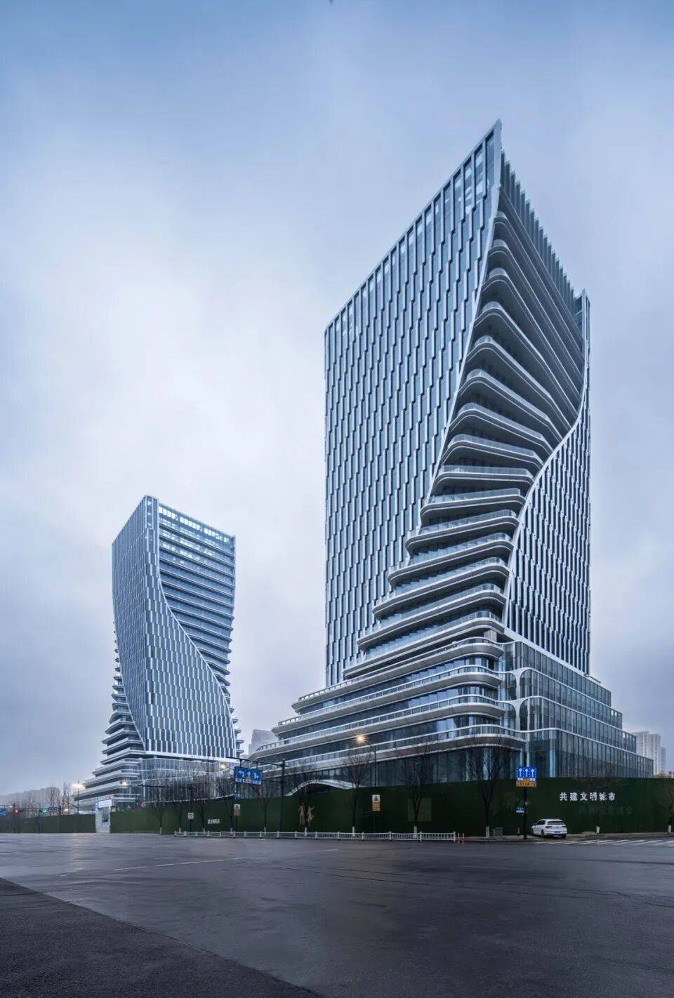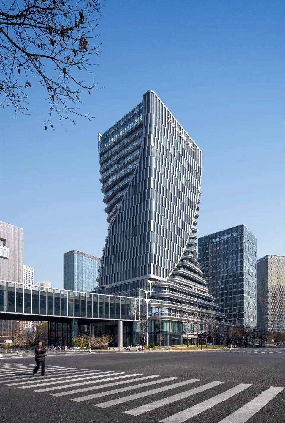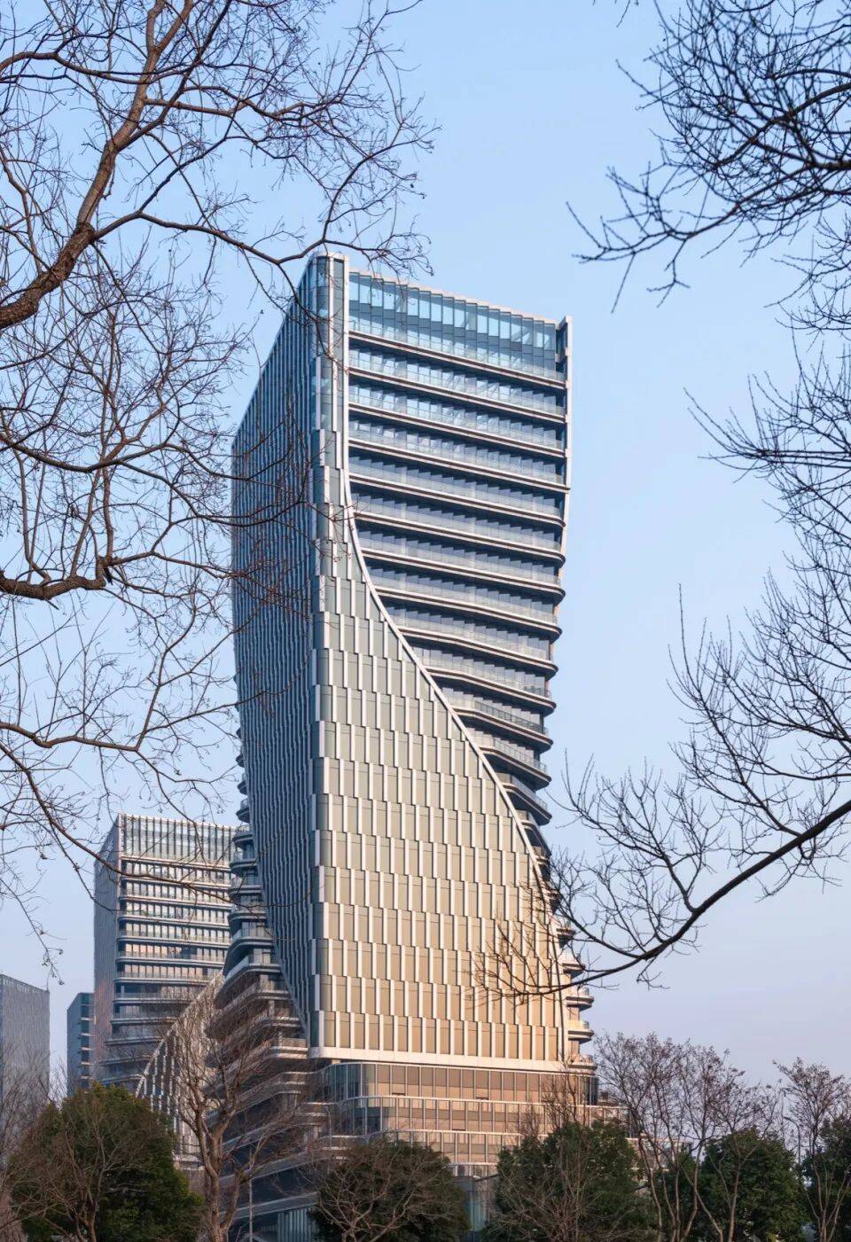 双塔扭转:塔楼外立面从底部裙楼向上扭转延伸,形成螺旋上升形态,象征“科技+金融”的双重驱动力;