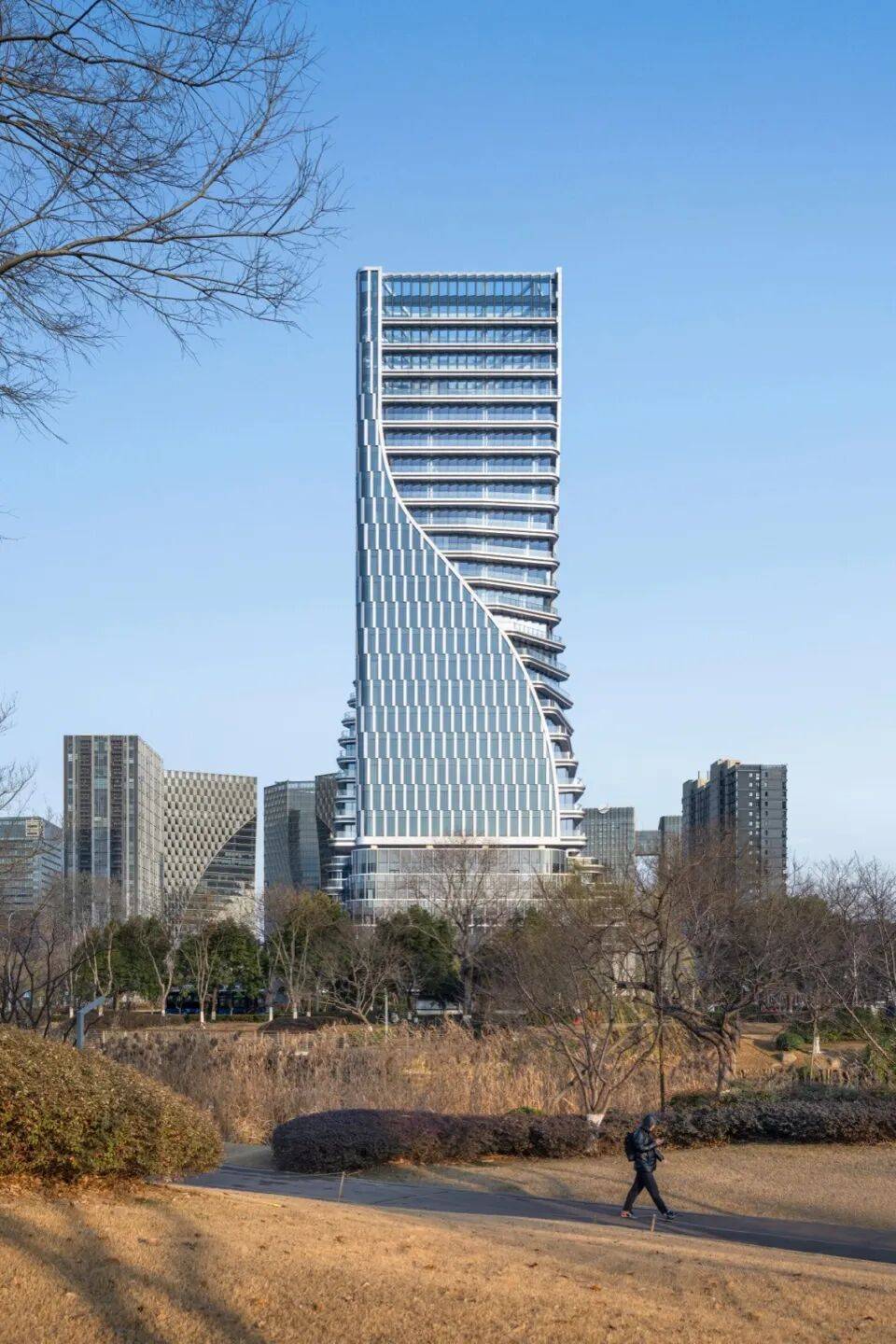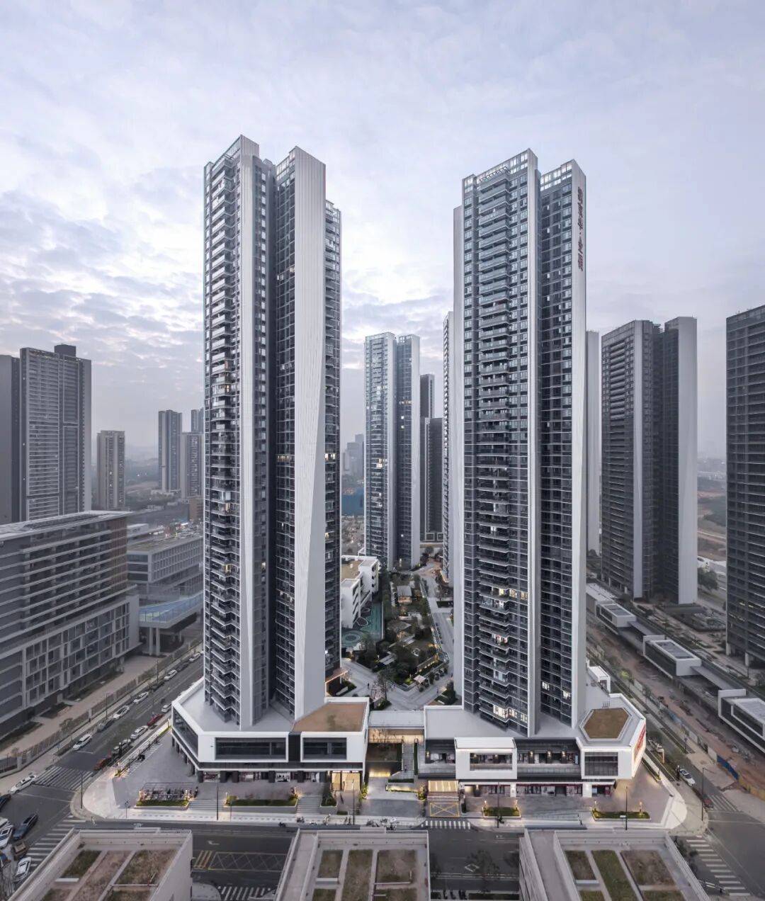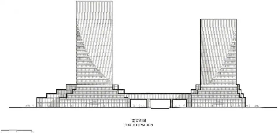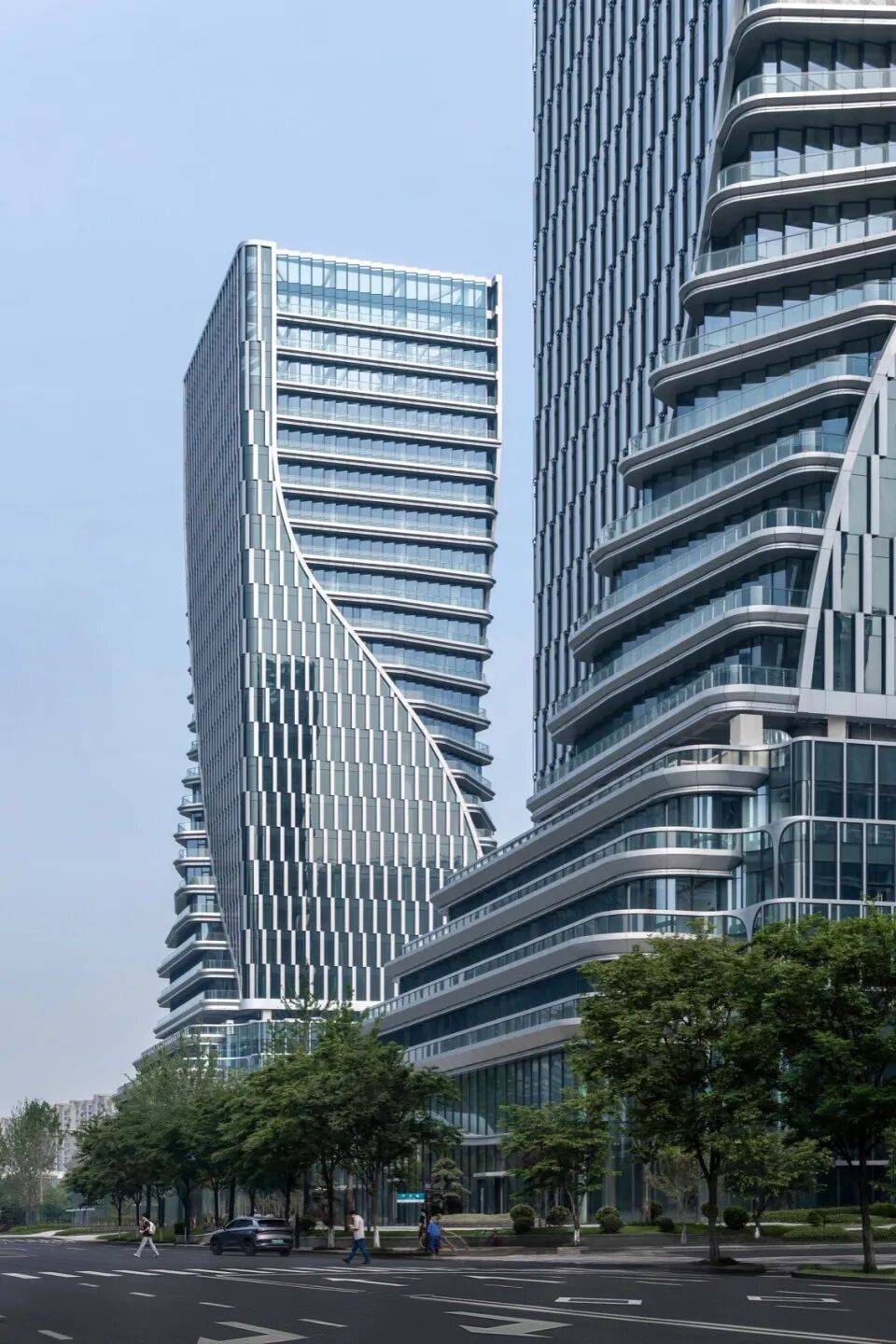 双塔扭转:塔楼外立面从底部裙楼向上扭转延伸,形成螺旋上升形态,象征“科技+金融”的双重驱动力;