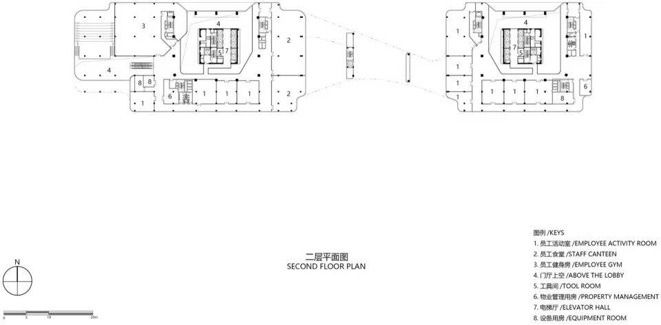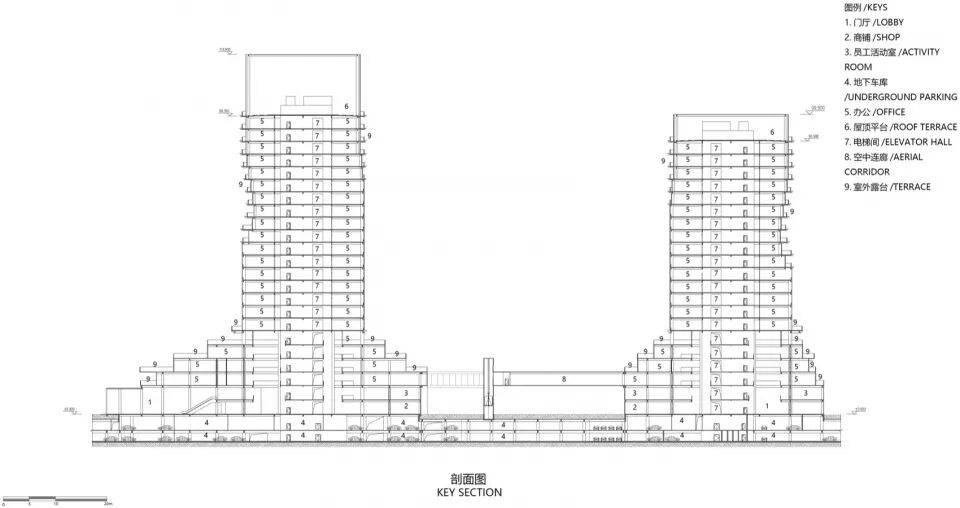 垂直动线:人群从街道汇聚至裙房平台,通过高空连廊引向塔楼,形成“地面-空中”的立体探索体验;