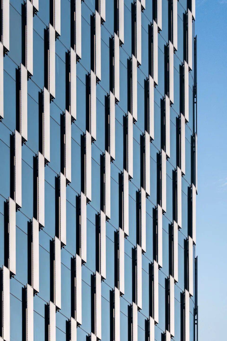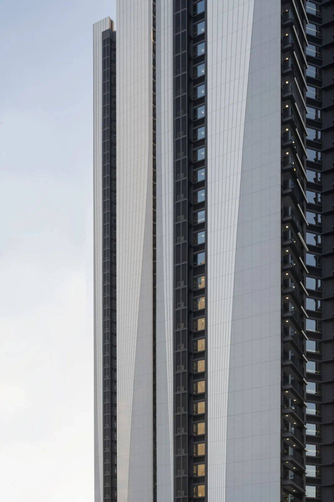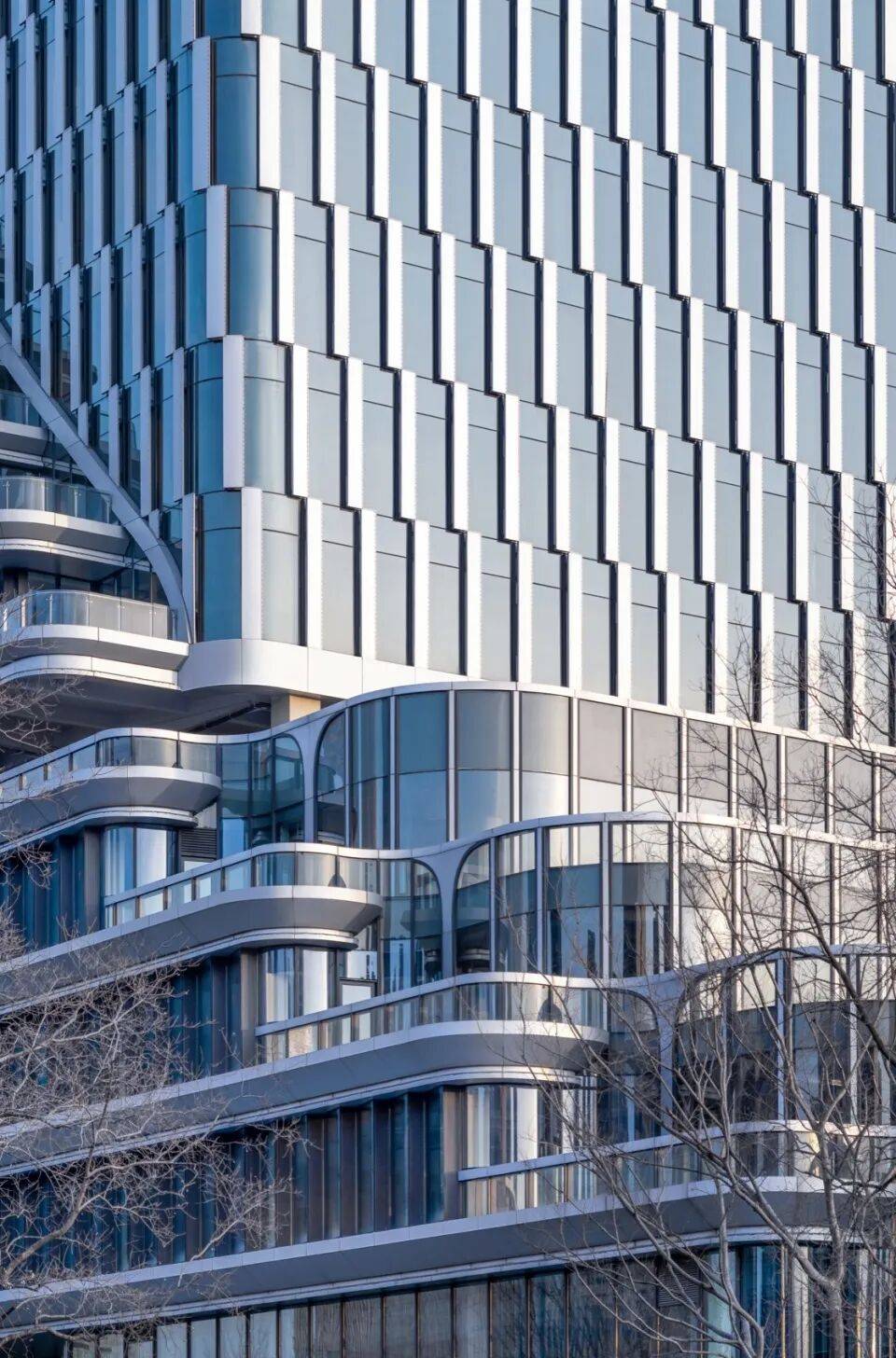 塔楼幕墙:外挂金属装饰构件单元,肌理随建筑扭转趋势错动,强化形体动态感;