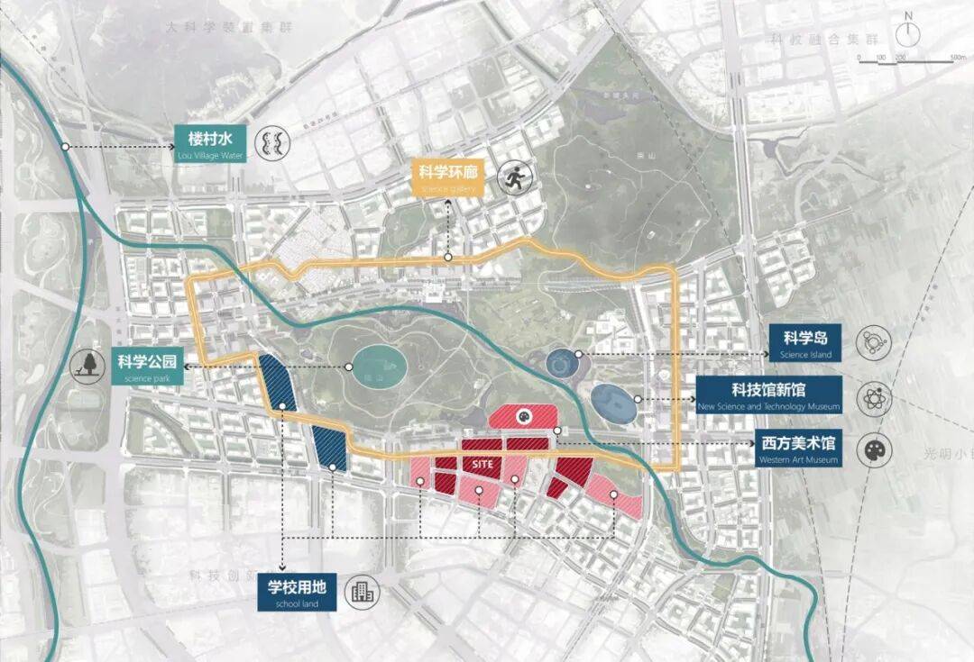 项目地处深圳光明科学城核心区,紧邻科学公园、科学环廊与科学方舟(CBD),是光明“城市会客厅”的关键节点。面对自然与公共文化交织的城市地块,设计需回答:住宅如何以艺术姿态介入城市核心,同时平衡材料成本与品质表达?