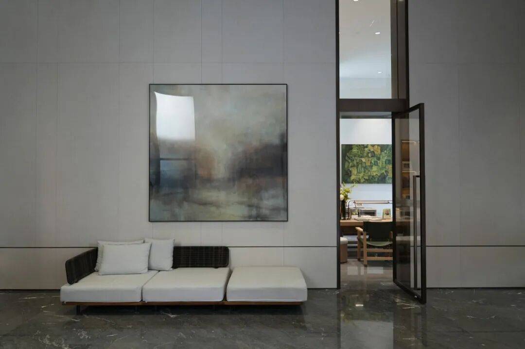 入户大堂:横向飘板采用木纹铝板,竖向墙面结合深灰色大理石与米白色洞石,通过材质对比营造典雅氛围;