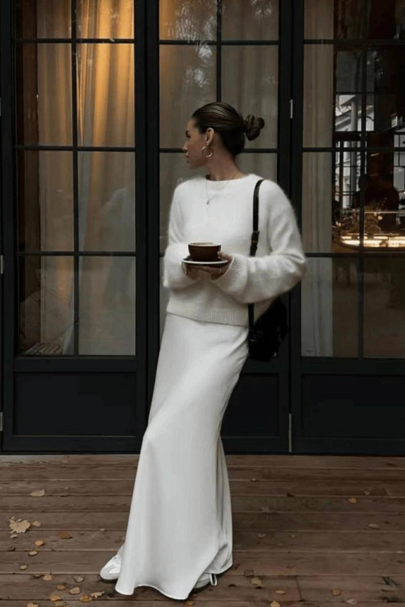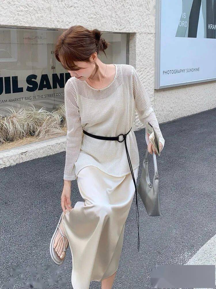 日常不知道怎么穿搭缎面裙的时候,用百搭“初恋”白色针织衫就可以撑起你的所有缎面裙搭配,将贵气优雅感释放得淋漓尽致。