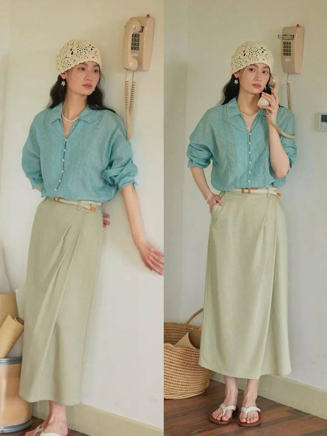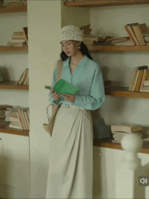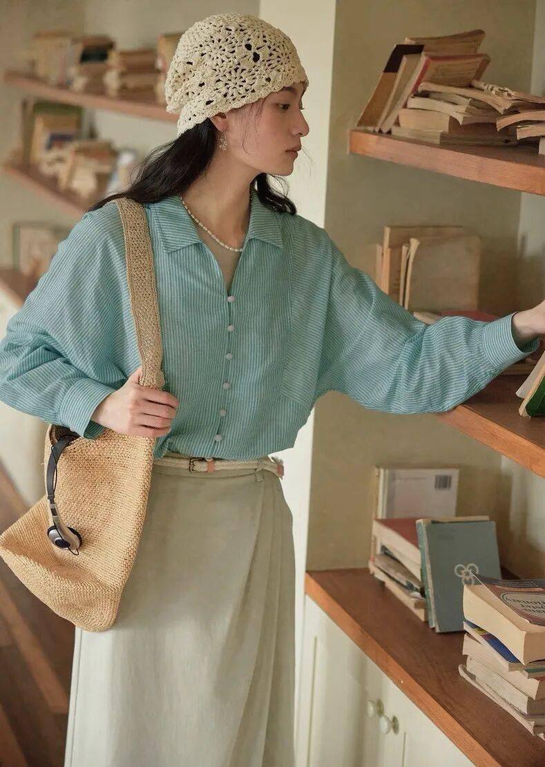 衬衫的薄荷绿底色中特别揉入了一抹瓦尔登湖的蓝调,这是经过多次调色定染的冰川色,不发灰不泛黄,清爽沁人又衬肤色;搭配温润恬静的杏色半裙,两种色彩碰撞出恰到好处的明亮与温柔,无论是通勤还是约会,都能给人带来舒服的视觉享受。