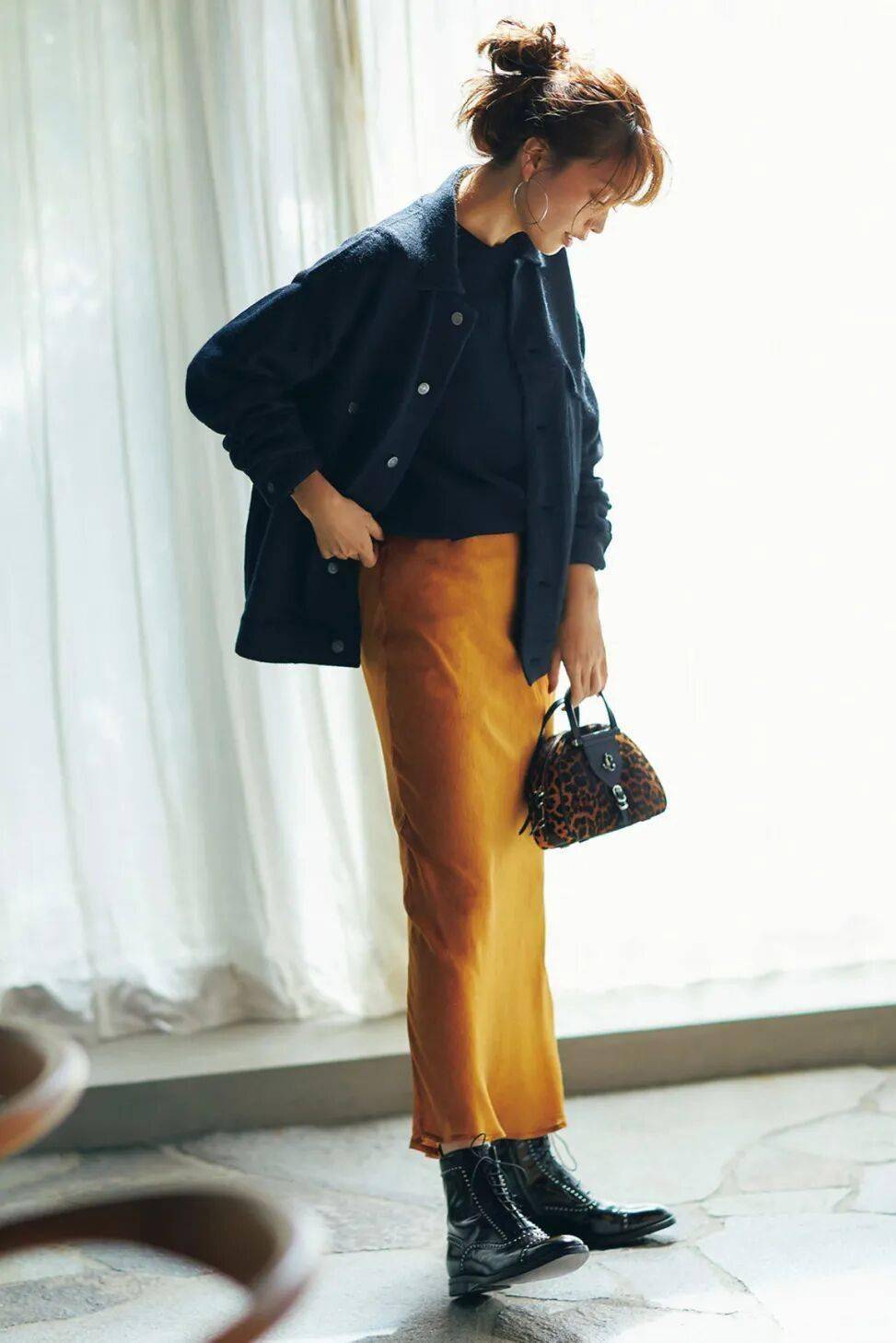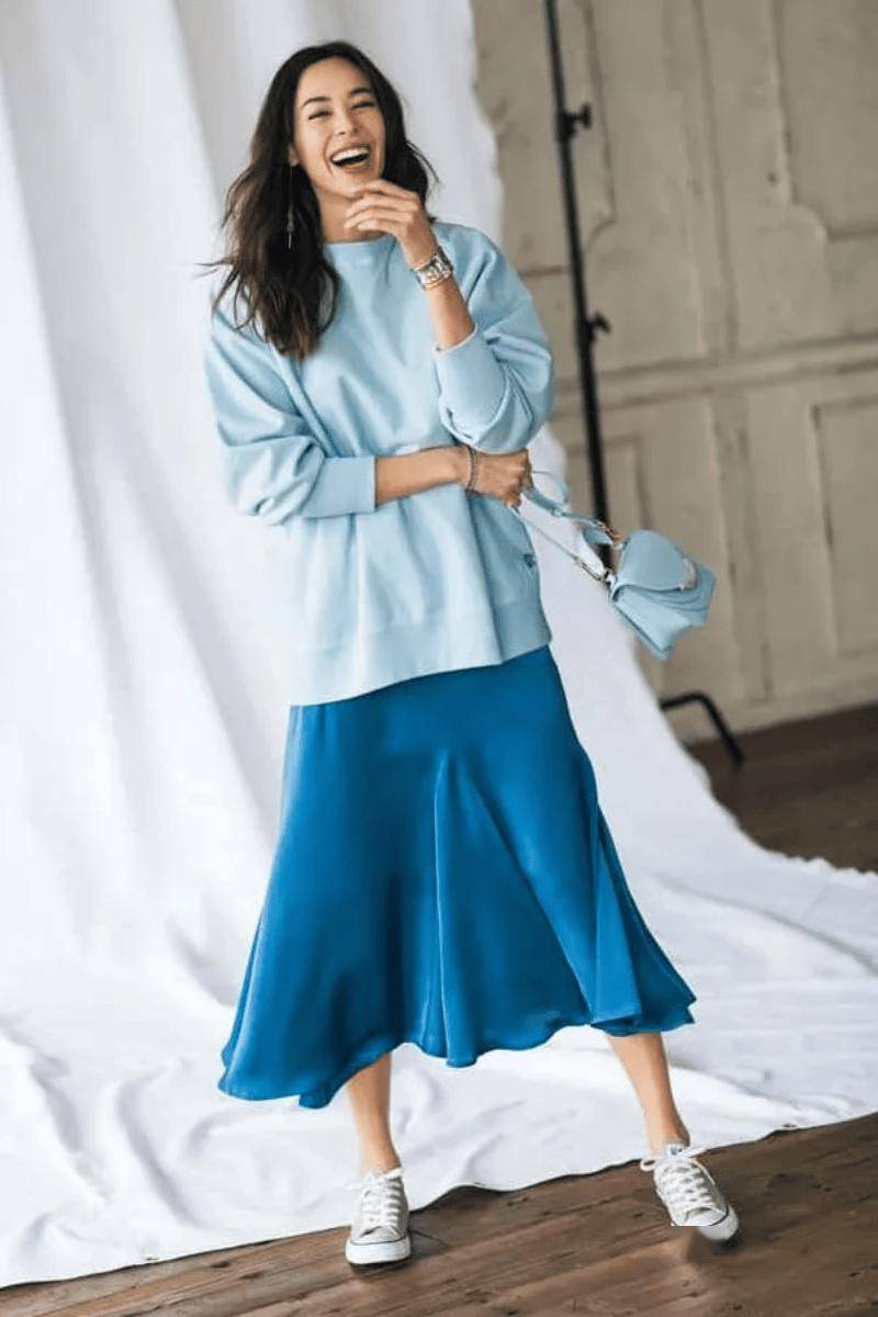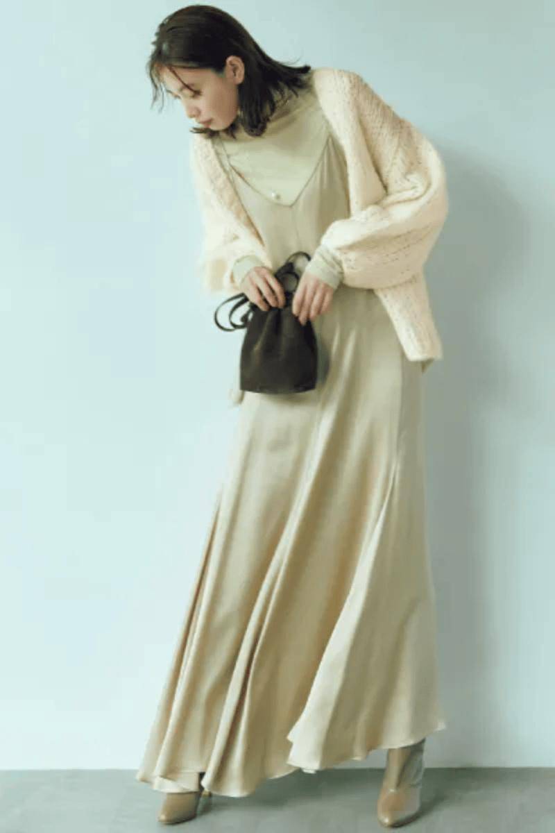 缎面裙与针织衫在质地上也有着鲜明的区分,因而也非常适合打造简约显贵的同色系搭配,