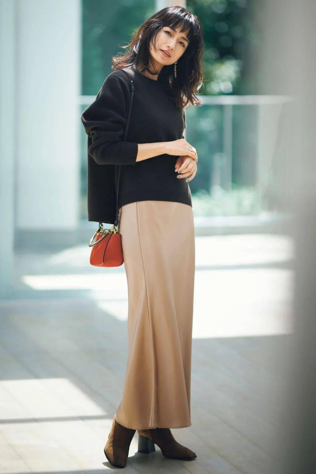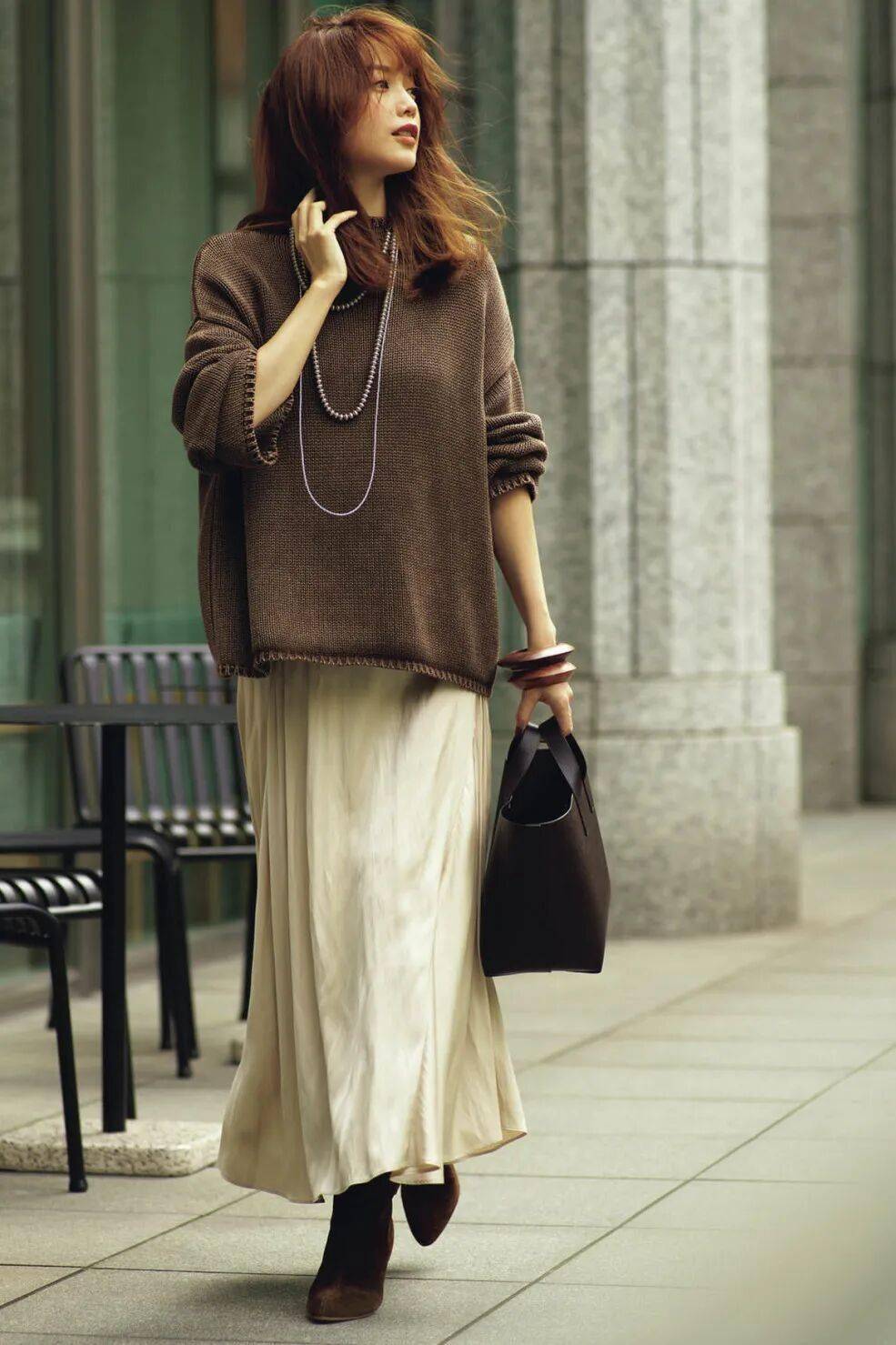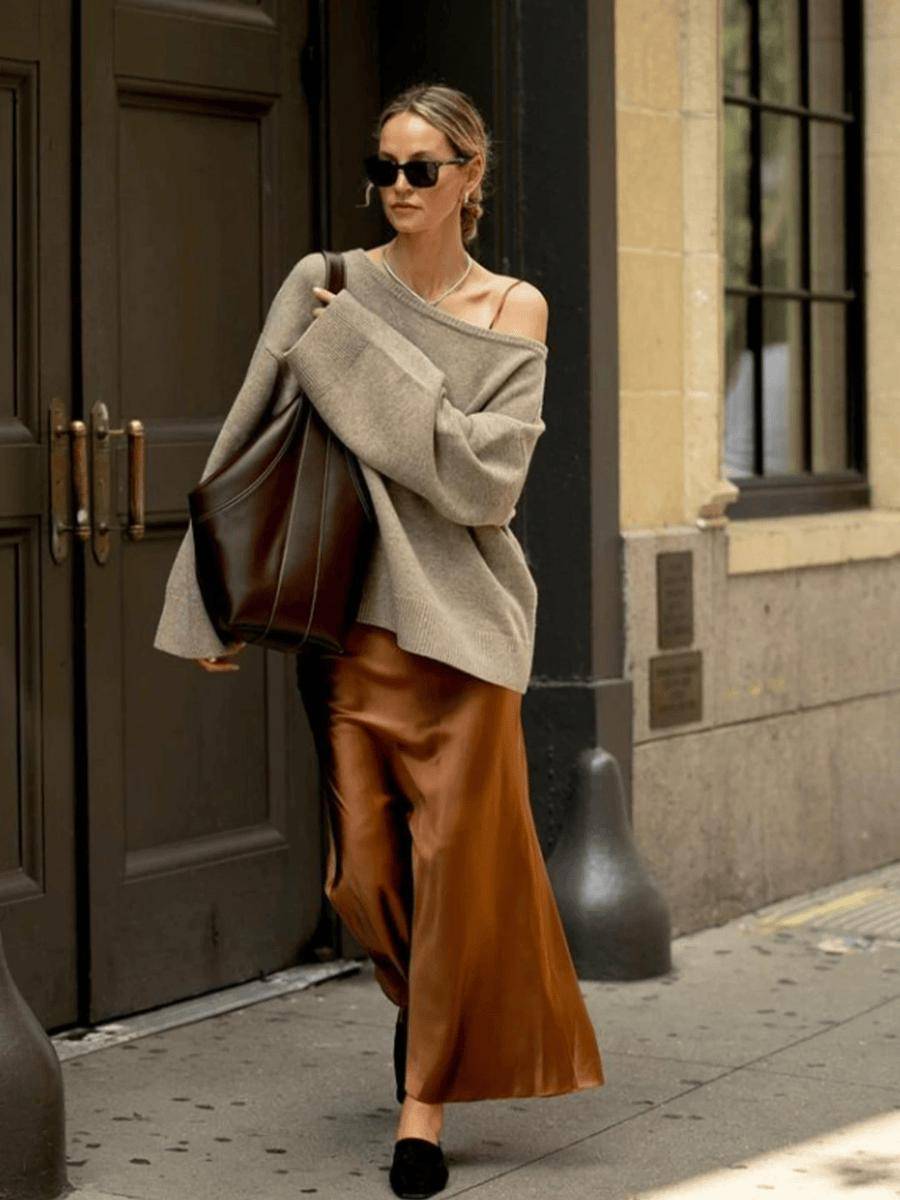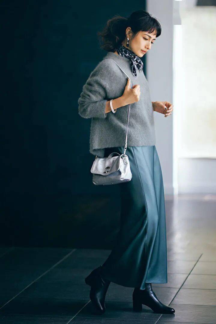 针织衫+缎面裙=简约贵气