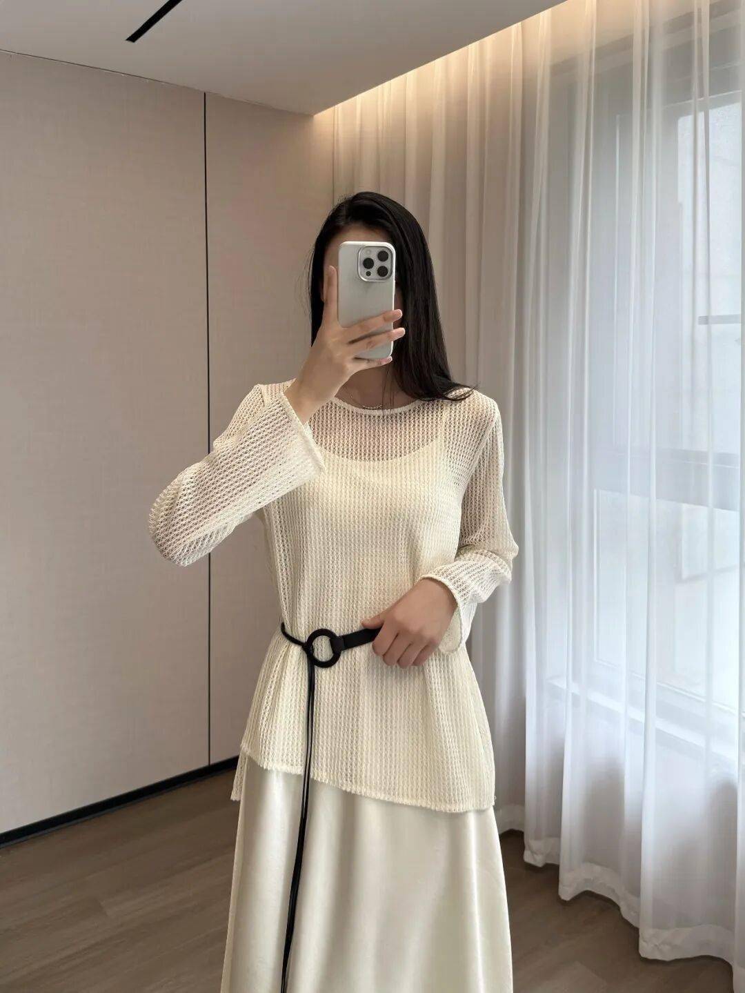 罩衫采用高支镂空针织工艺,织纹细密通透,上身轻盈无负担。
