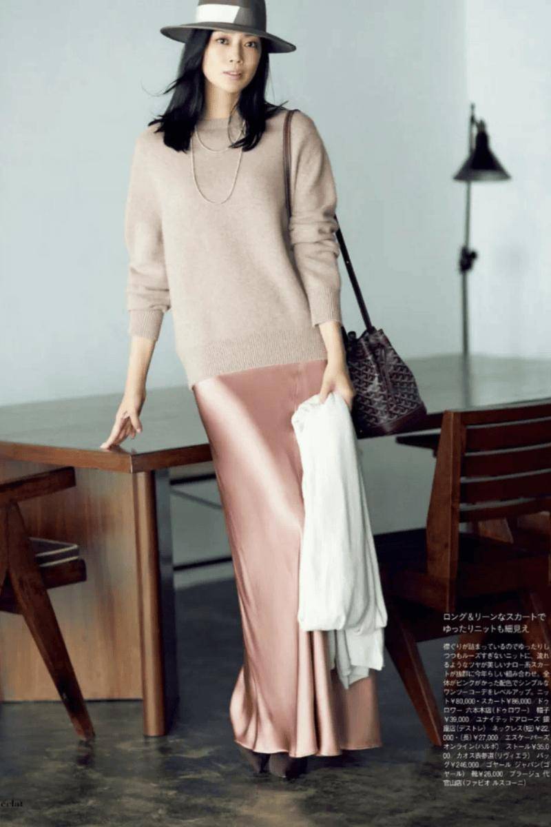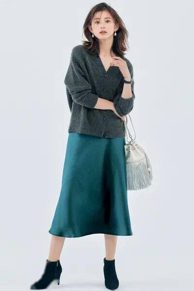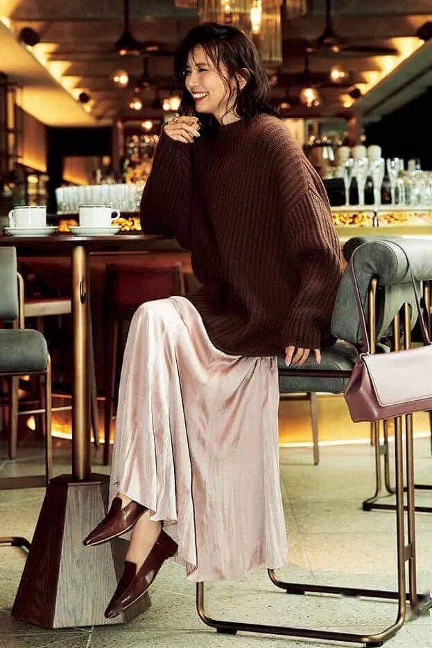 针织衫+缎面裙称得上既美又显贵的富家小姐姐理想组合。