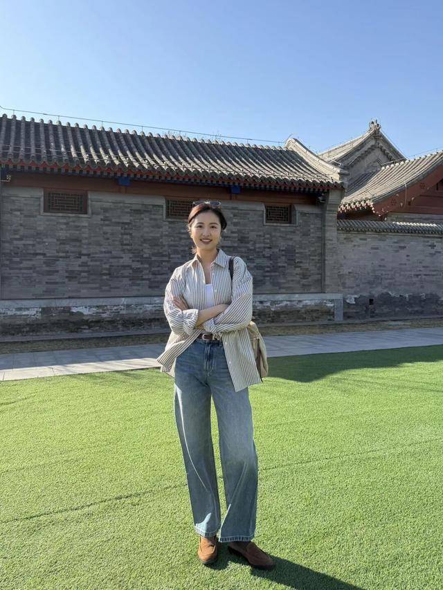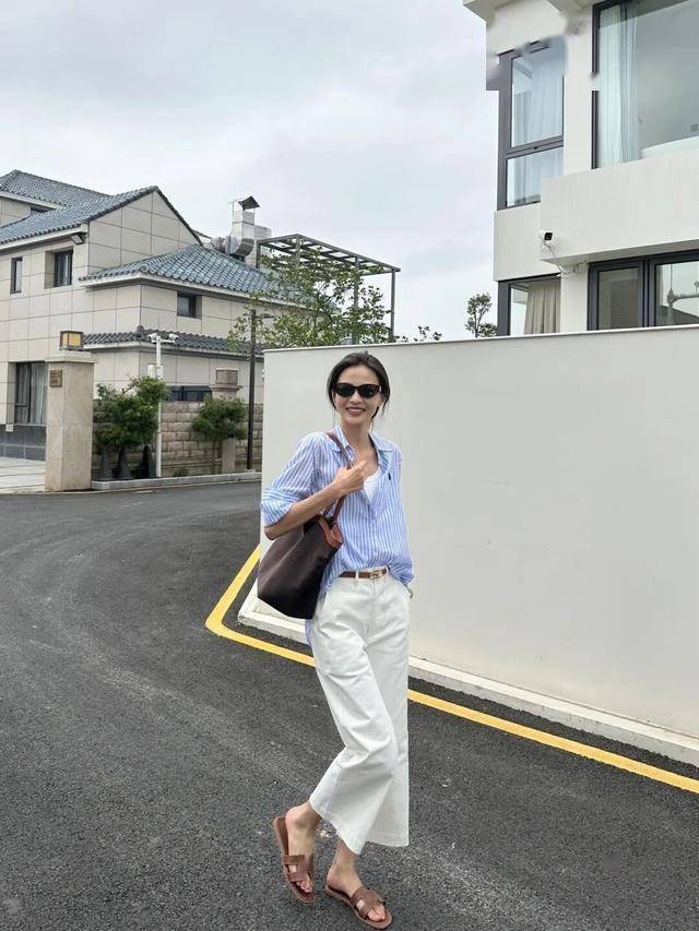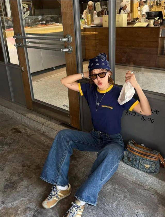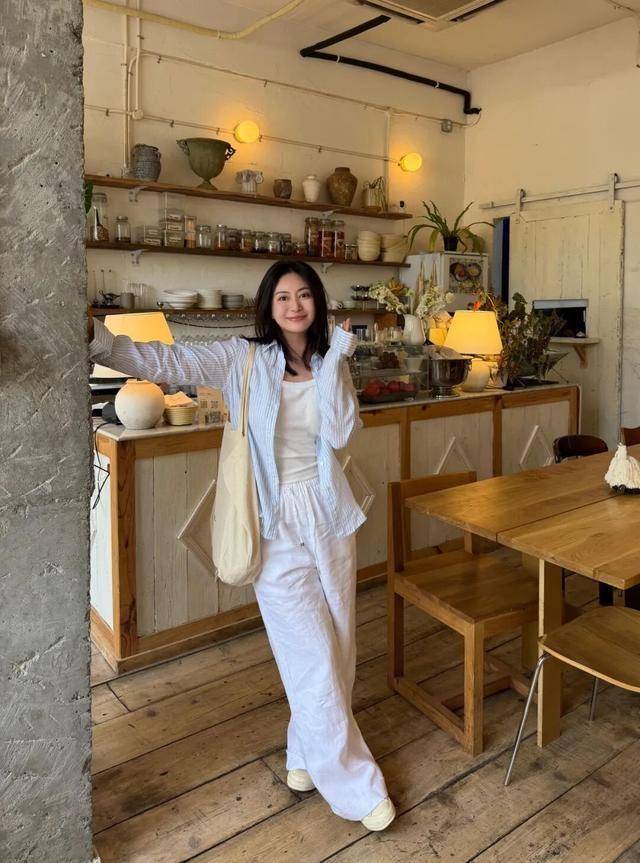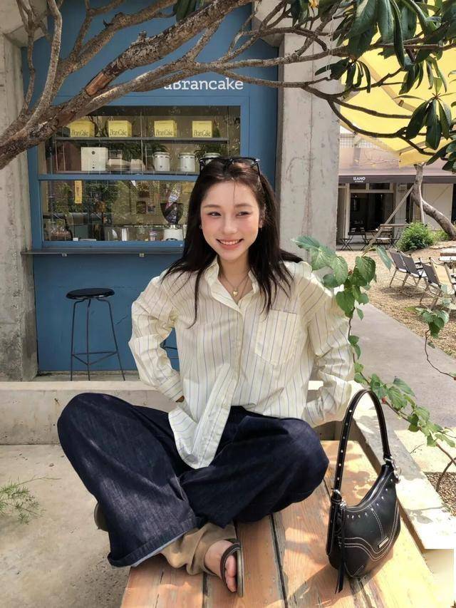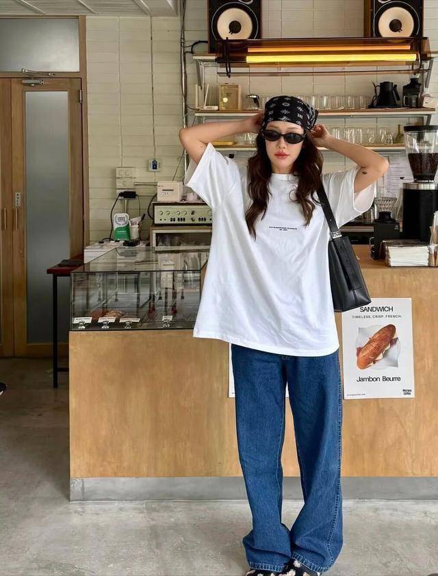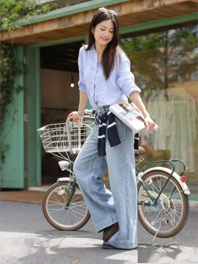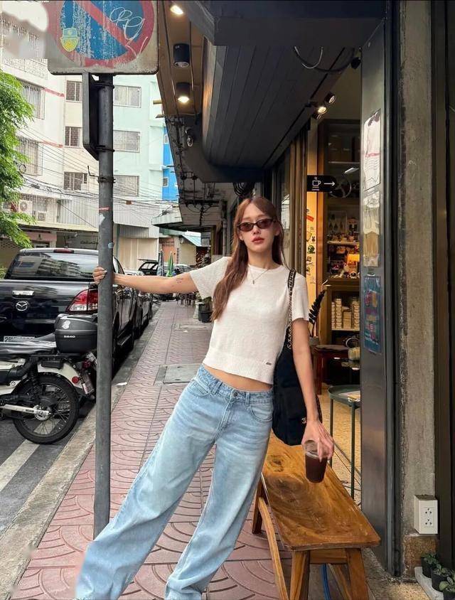 搭配:白色短袖衬衫 + 浅蓝色高腰牛仔裤 + 小白鞋