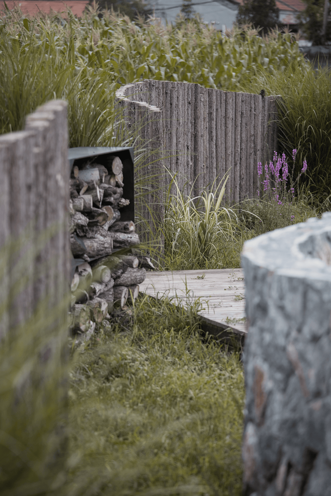 通过木质栈道与碎石小径连接各功能区,既保持场地自然肌理,又引导游客动线。