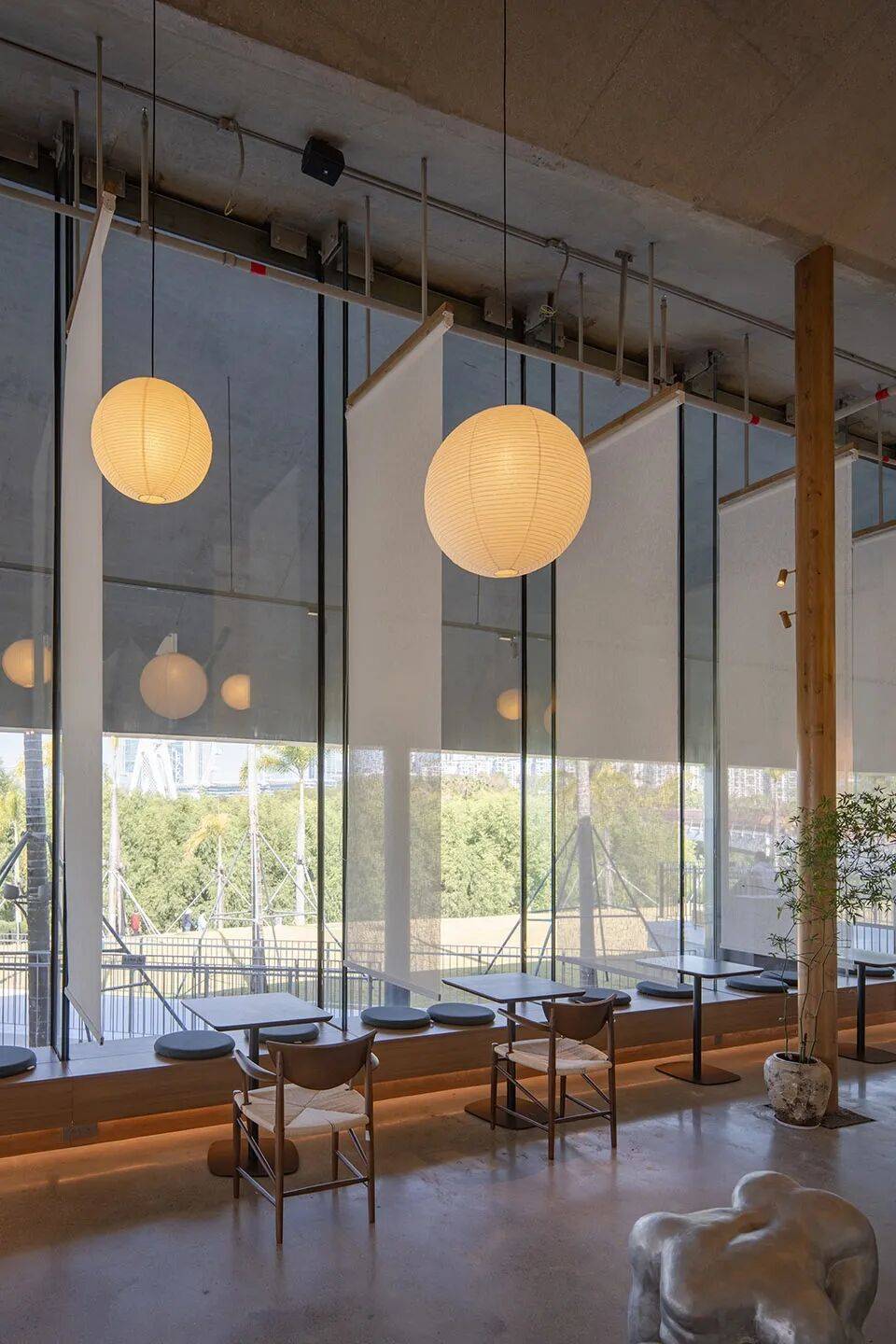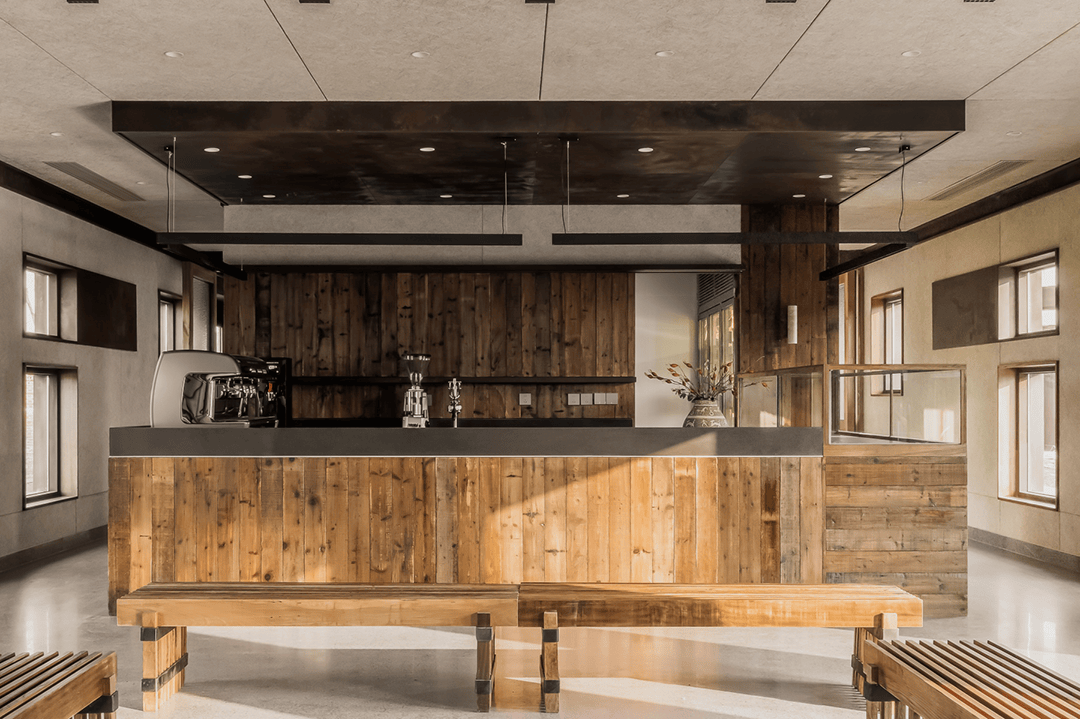 保留原始混凝土结构的粗糙质感,搭配暖色调木饰面与织物软装,平衡工业风的冷峻与咖啡空间的温馨;
