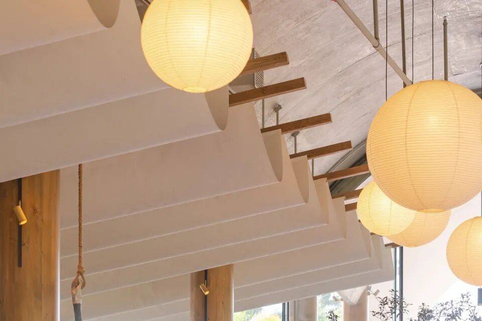 屋顶覆盖本地芦苇编织的遮阳帘,既过滤强光,又形成动态光影效果;