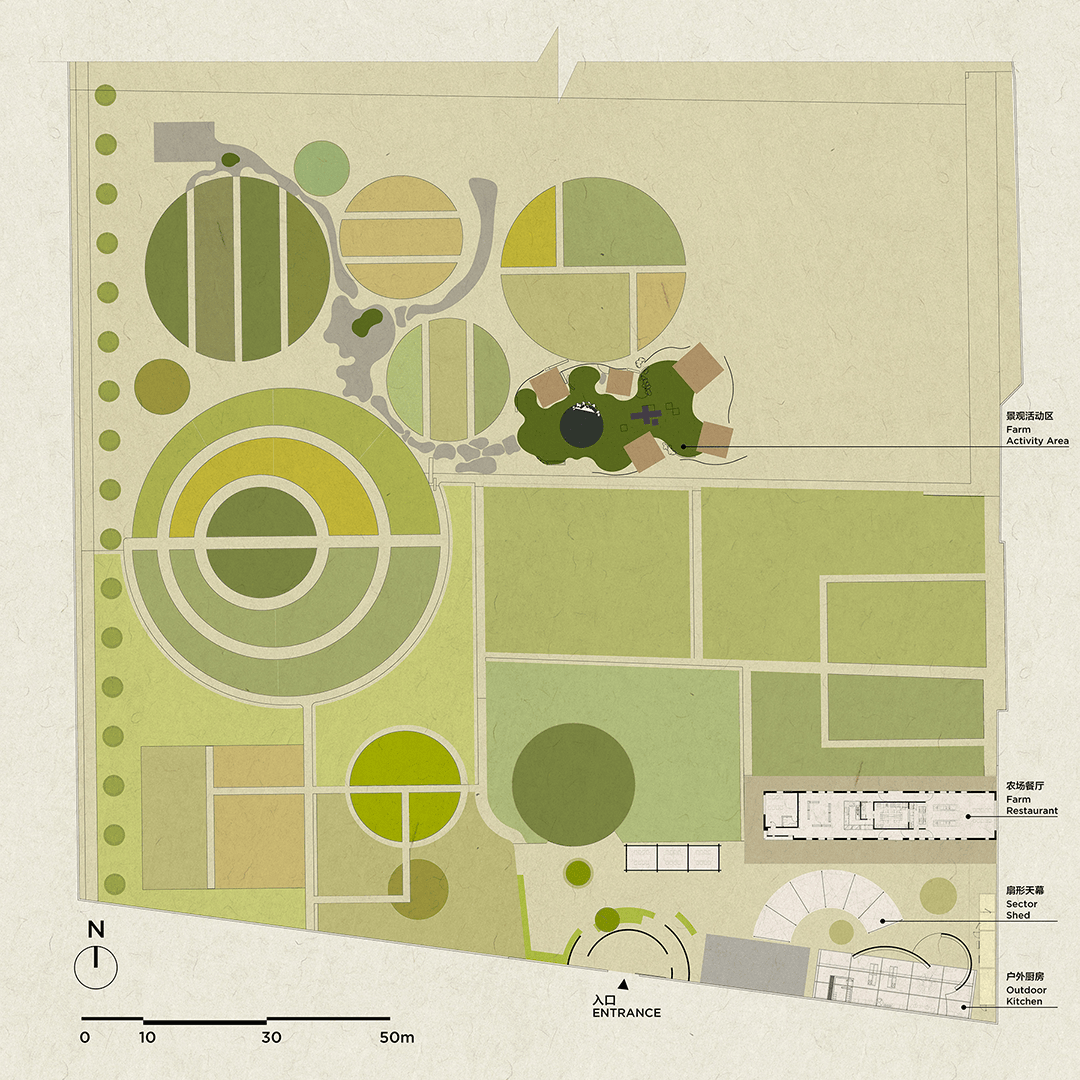 以农场中央的露天灶台为核心,辐射出种植区、餐饮区、手作工坊与休息区,形成“生产-加工-消费”的完整链条;