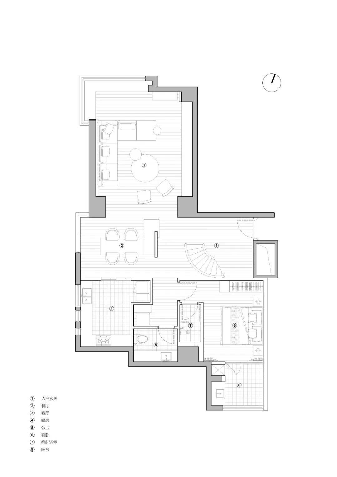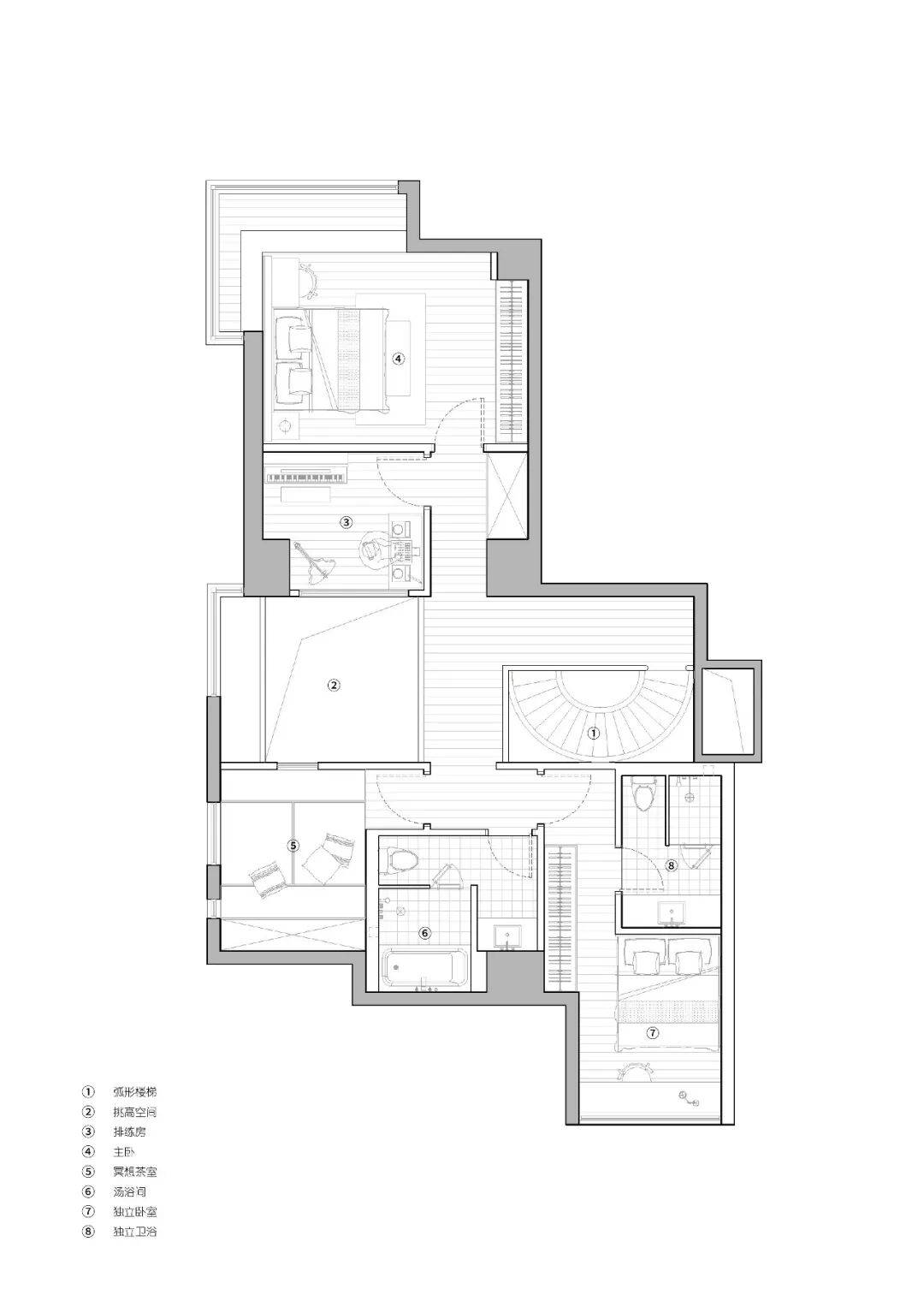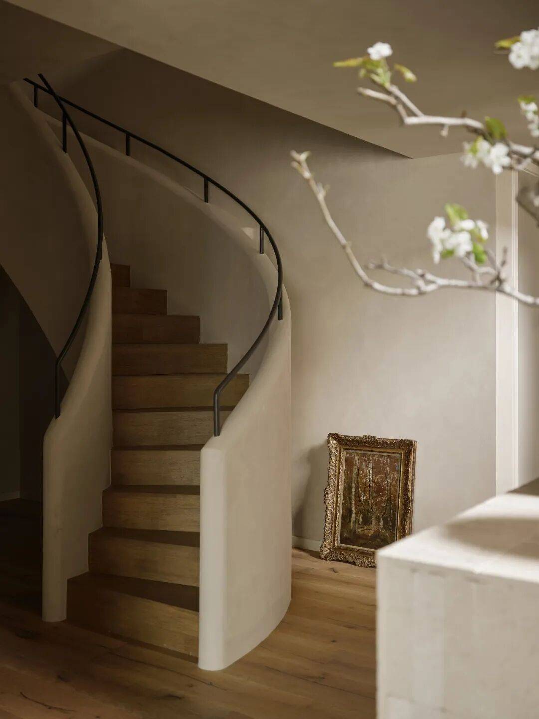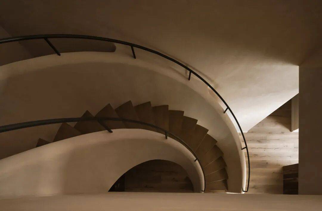 手术式改造:局部打开楼板形成挑高中庭,以弧形楼梯为核心串联上下层,视线与气息自由流动,激活空间活力。
