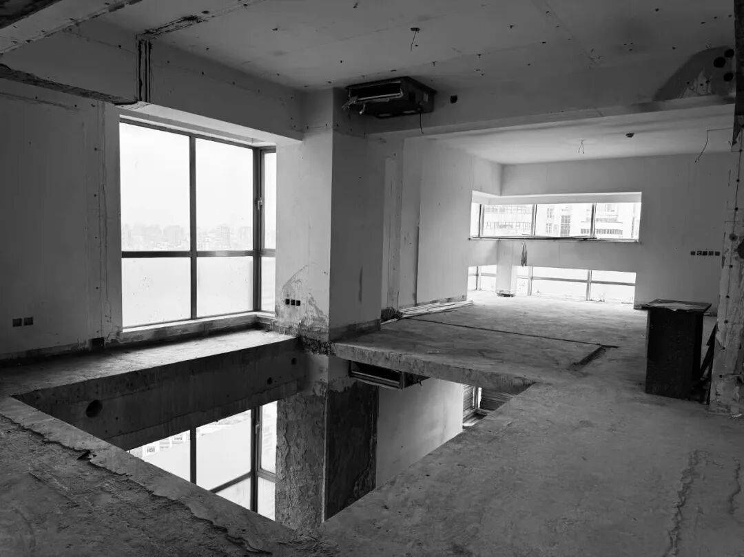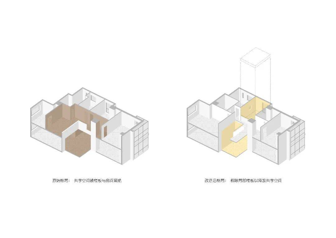 问题诊断:原始双层空间封闭割裂,楼板完整导致层间缺乏互动,氛围压抑。