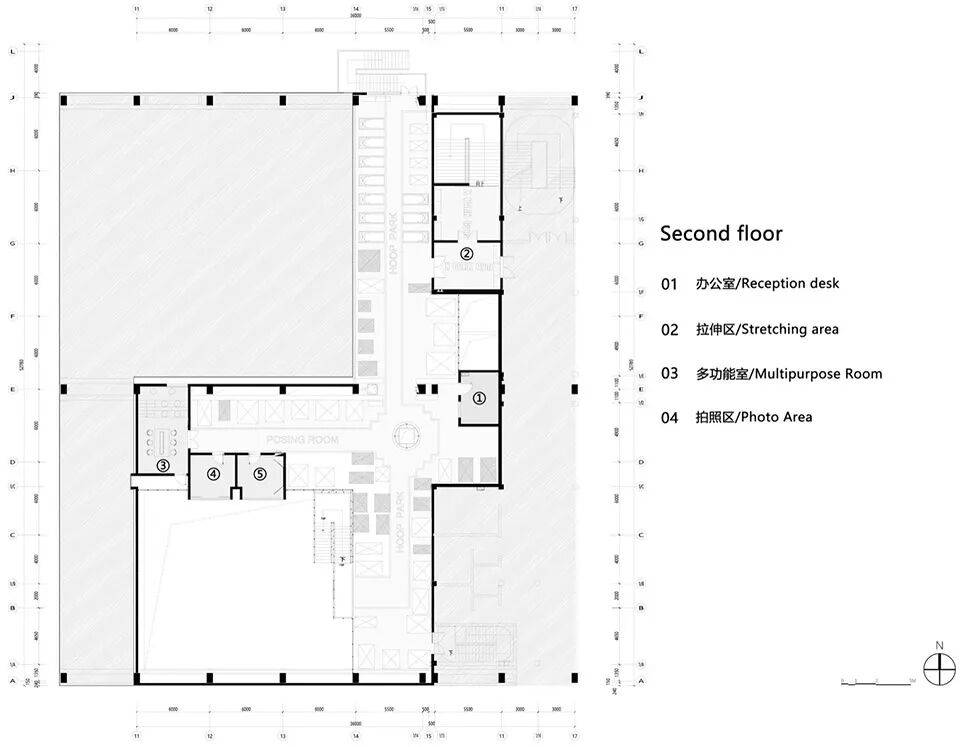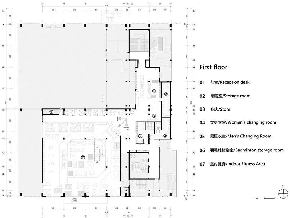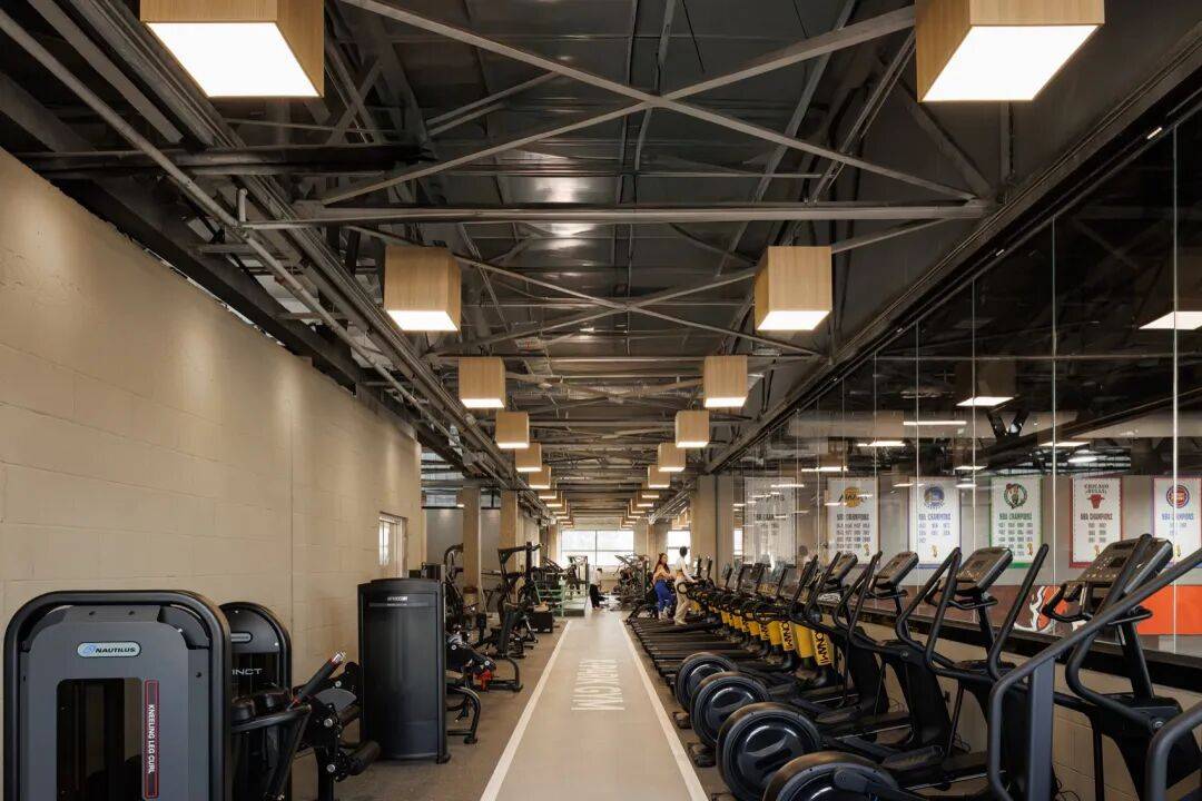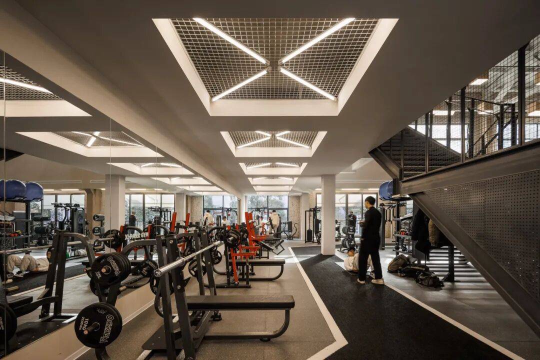 训练区:镀锌格栅墙面与EPDM地胶强化力量感与秩序感,11米挑高区域成为核心能量场;