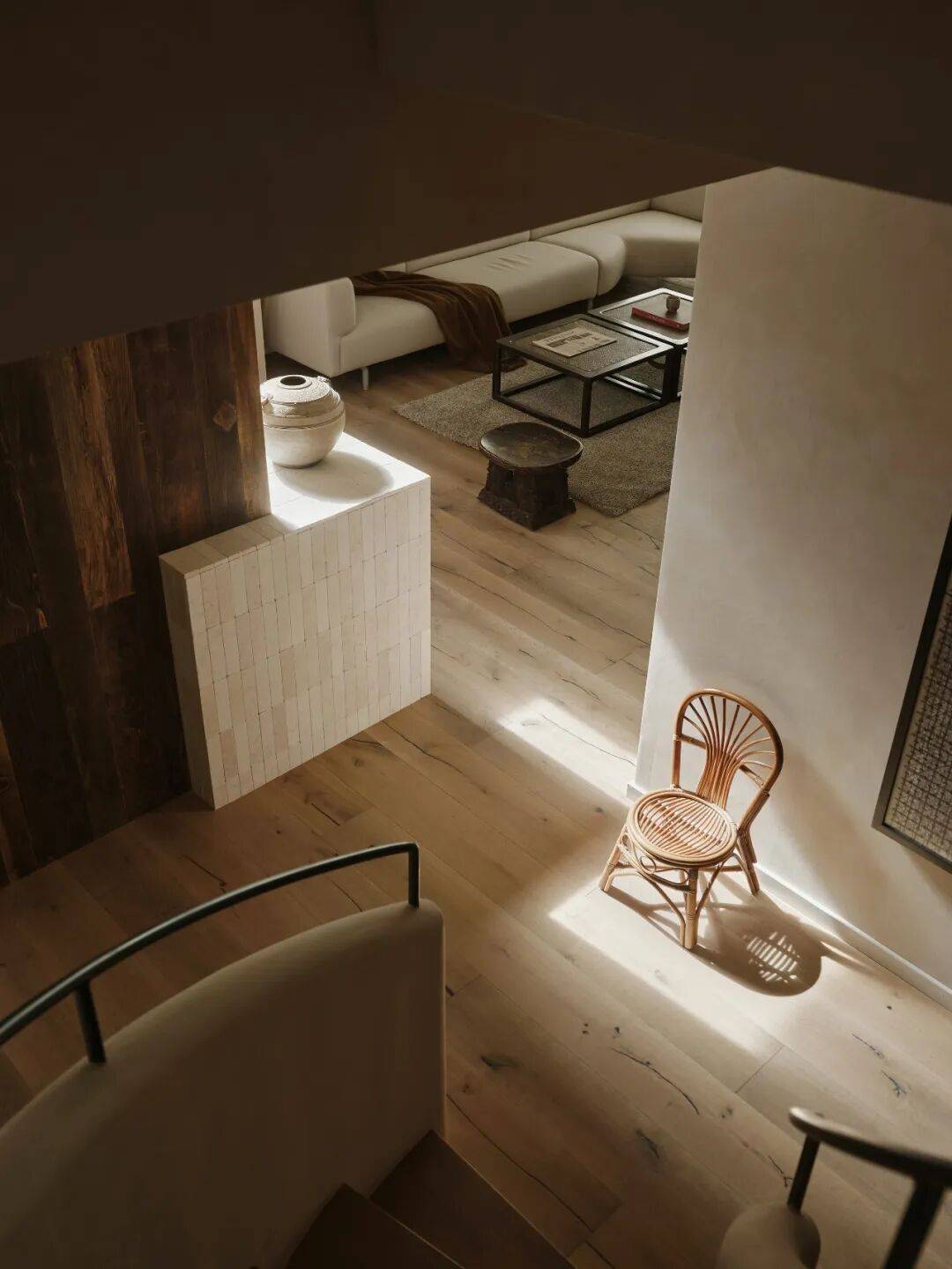 光影诗学:午后西向阳光漫入,在挑空空间与弧形楼梯间投下温暖光影,与竹笛演奏的专注气质高度契合,营造松弛氛围。