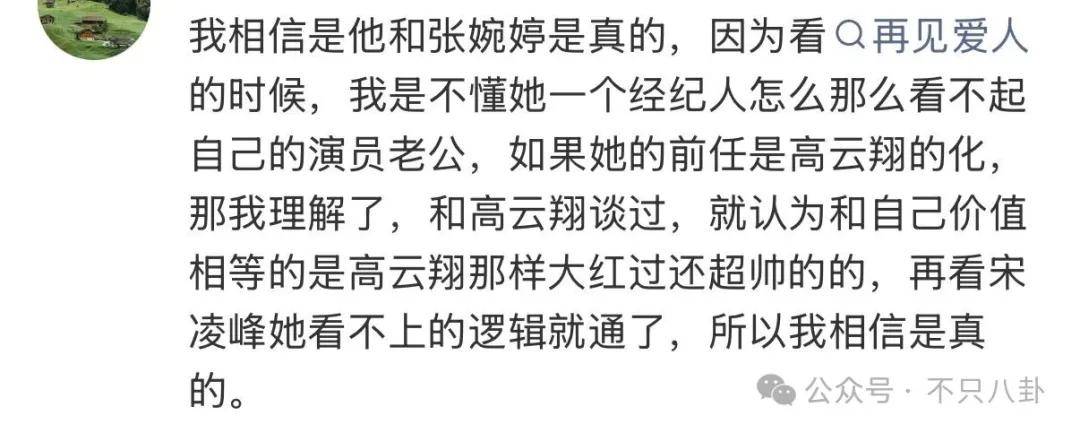 图片看到这里,网友说张婉婷宋宁峰两口子其实都在玩“替身文学”。张婉婷觉得宋宁峰和高云翔一样也是明星,也是高大帅气的北方男人→峰峰类翔;宋宁峰觉得Q女士和初相识时的齐溪一样年轻,都是174高妹,名字都带Q→QQ类溪……
