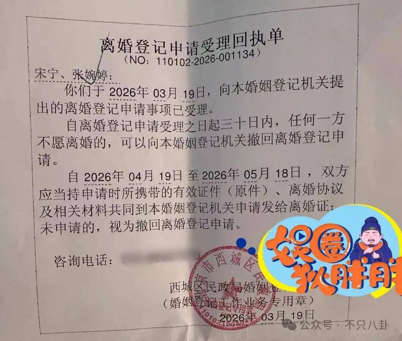 图片别看张婉婷口中的宋宁峰窝窝囊囊的,但他貌似是真想过和张婉婷离婚。前几天,Q女士曝出了宋宁峰与张婉婷的离婚登记申请受理回执单,上面显示,两人已于3月19日申请离婚,度过冷静期后就可以离婚了。照回执单上的日期来看,现在正是俩人可以“动真格的”离婚的期限啊!