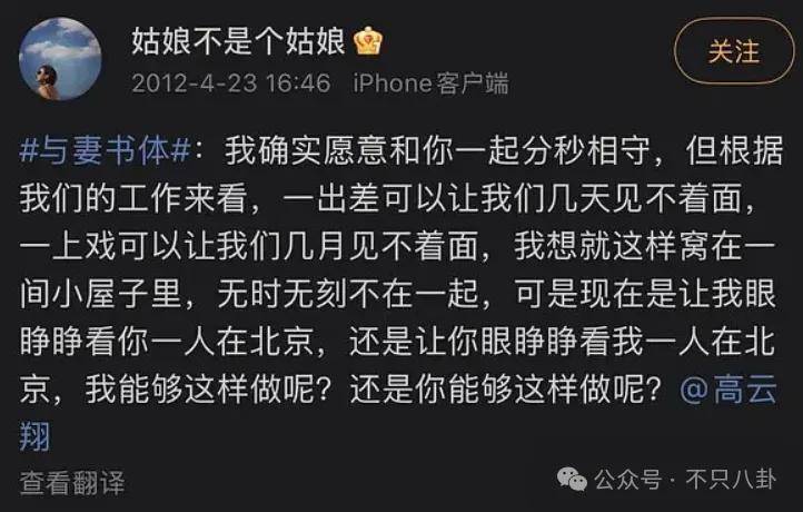 2012年4月:张婉婷在微博用"与妻书"体@高云翔,内容暧昧