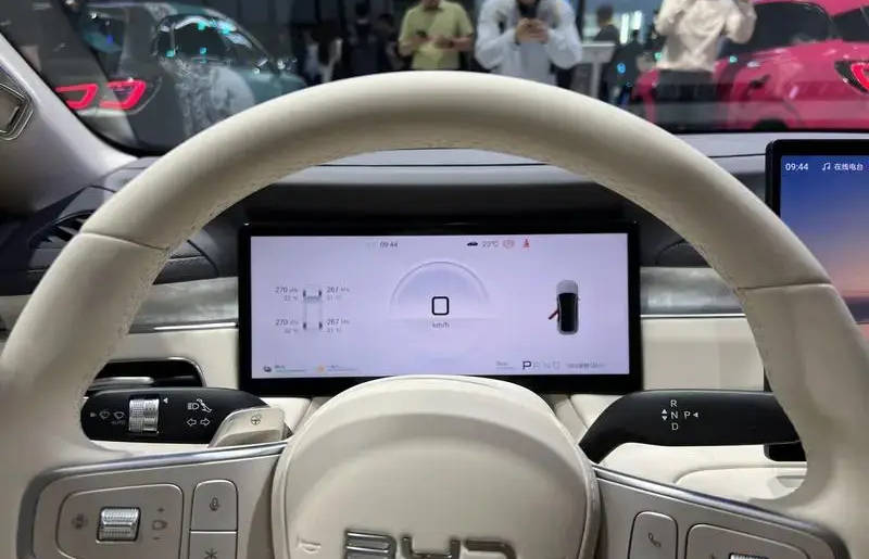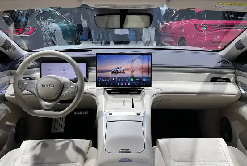 内饰方面,新车搭载海洋美学2.0全新旗舰座舱,中控台设计较为简洁,配备了大尺寸悬浮中控屏以及液晶仪表。此外,新车还搭载三辐方向盘,前排还配备了手机无线充电功能。