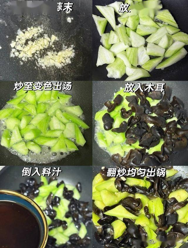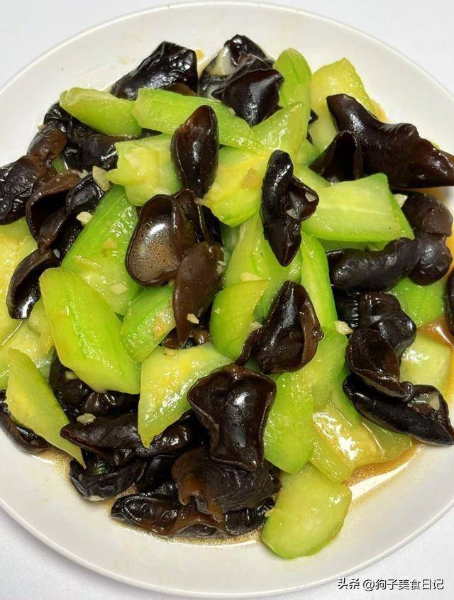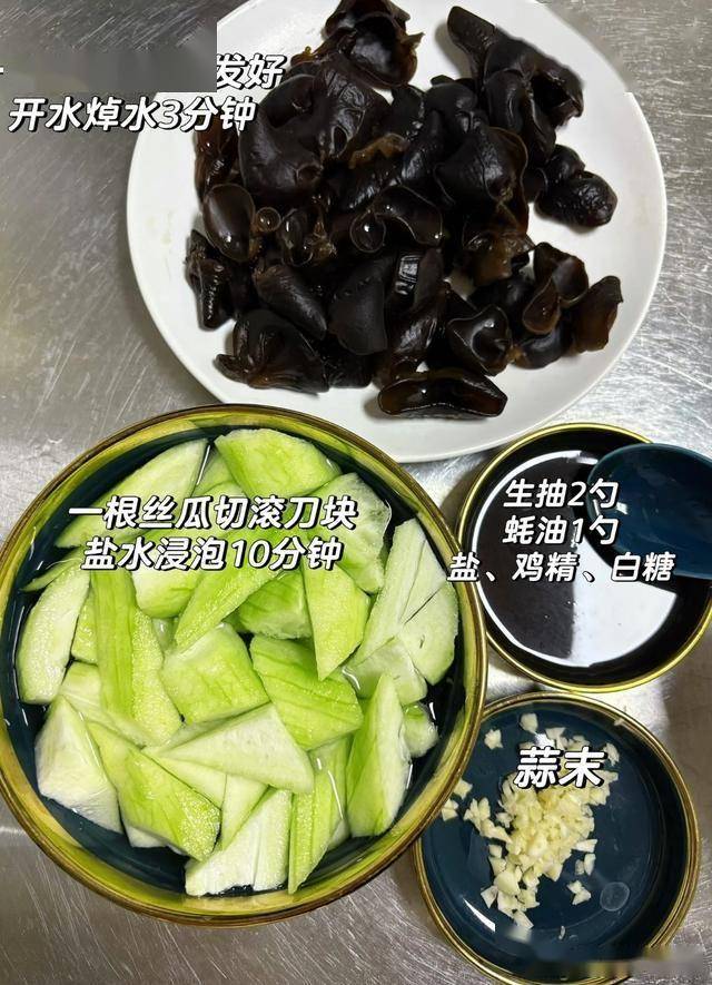 做法:丝瓜切片,木耳提前泡发,快速炒制。