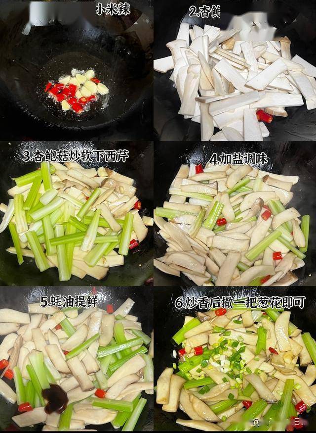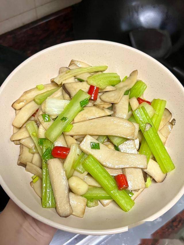 做法:芹菜和杏鲍菇切片,快速翻炒至熟,加入蒜末提味。