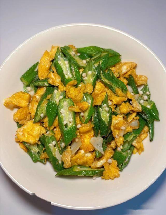 做法:秋葵焯水后切片,与打散的鸡蛋一起炒制。