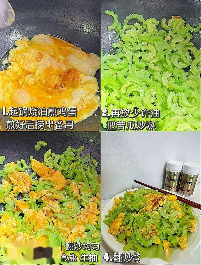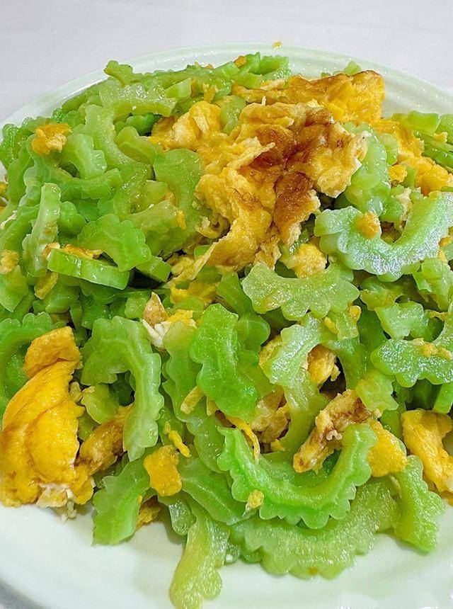 做法:苦瓜切片焯水去苦味后过冷水,鸡蛋打散后与苦瓜一起快速翻炒。