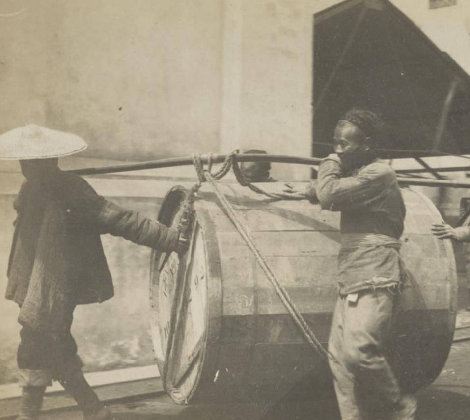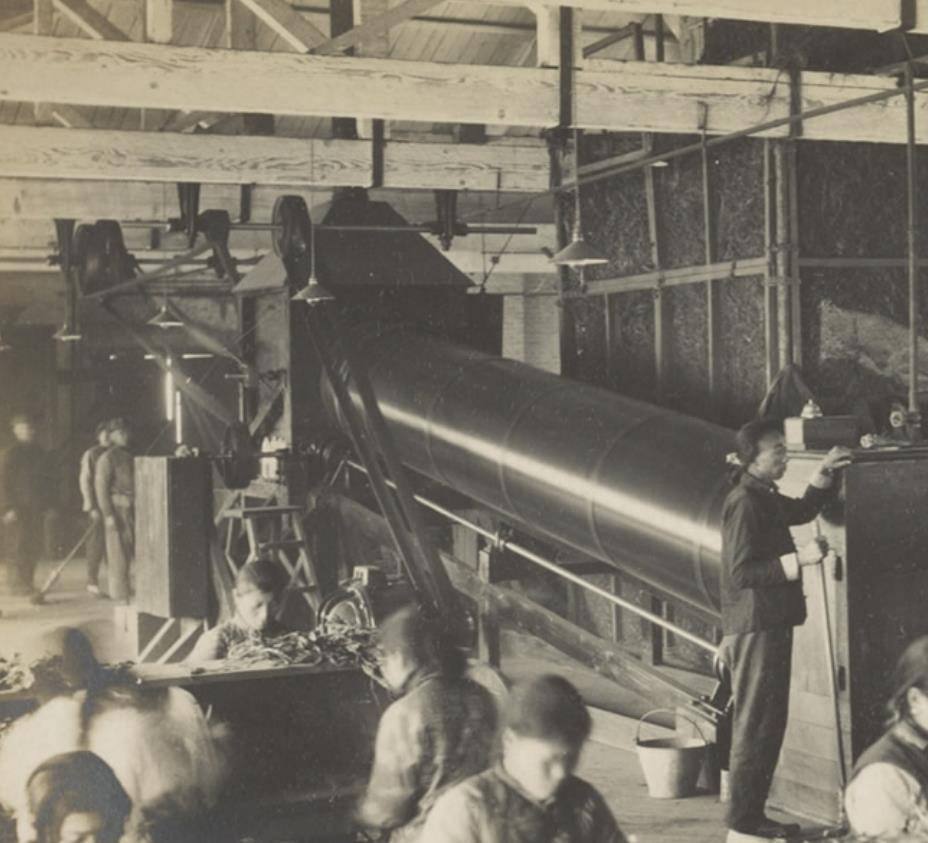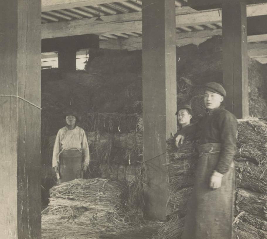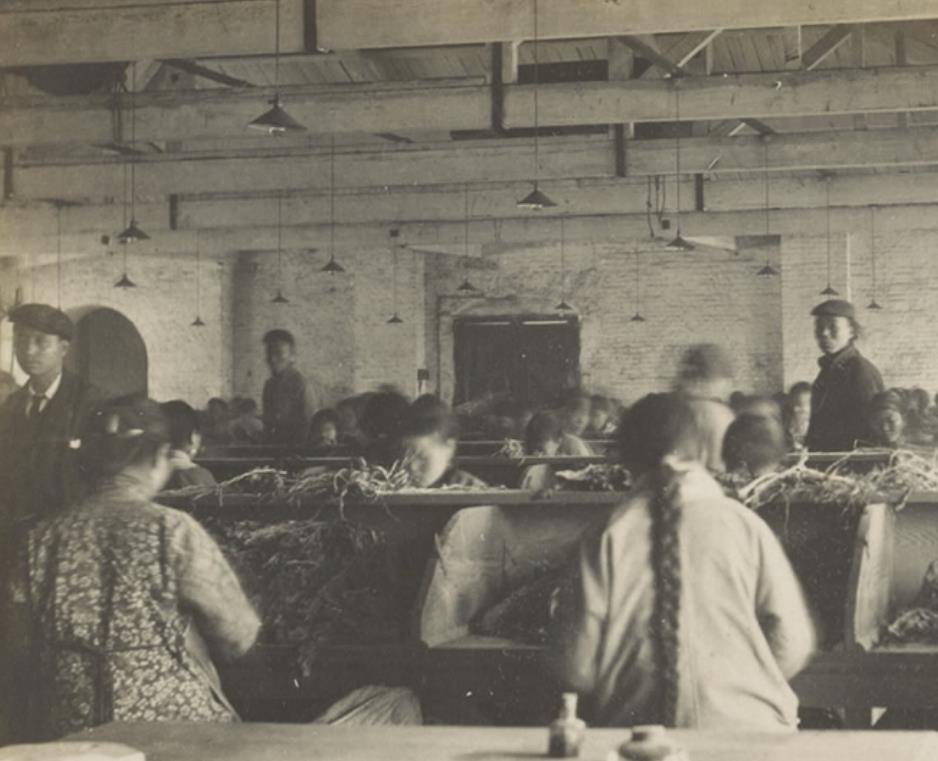 这张照片拍摄于1906年,展示了武汉英美烟草公司汉口工厂当时物资存放的厂房。从这张图中,我们可以看到工厂内部的陈旧与简陋,也能窥见晚清时期工人工作的环境。那些在流水线上辛勤劳作的工人,都是受过专业训练的高素质人员,而那些未经过专业培训的人则只能从事一些粗重的体力劳动。这种工厂内的分工,正体现了当时社会对劳动力的严格区分。