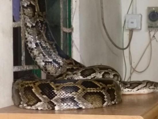 只见大蟒蛇前半身卷曲于一个木柜顶,后半身则挂于窗花上,极为吓人,慌忙致电报警。