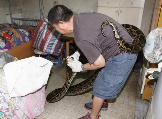 人蛇搏斗10分钟后,专业人士体力将耗尽,立即呼唤在屋外的警员协助,在窗外将蛇尾向屋内推,他则乘机将蠎蛇拉离柜顶,但蠎蛇依然奋力“抗捕”,蛇身更卷着蛇王腰部。最后,蛇王一鼓作气,将蠎蛇拉起,在警员协助下放进布袋。蛇王表示,该条蠎蛇为缅甸蠎,雄性,4.5米长,年龄70至80岁,约50斤 |